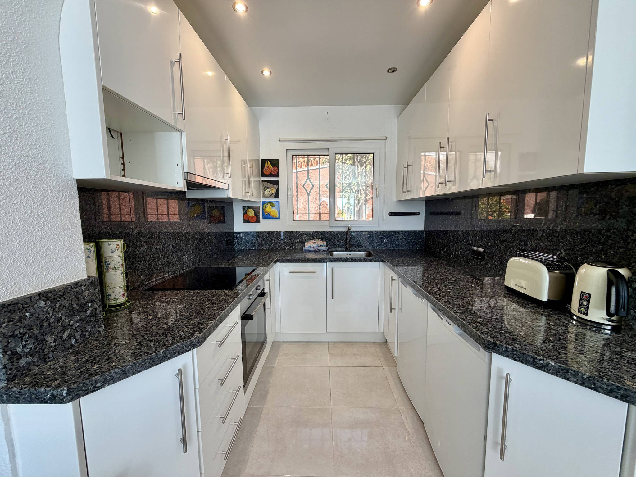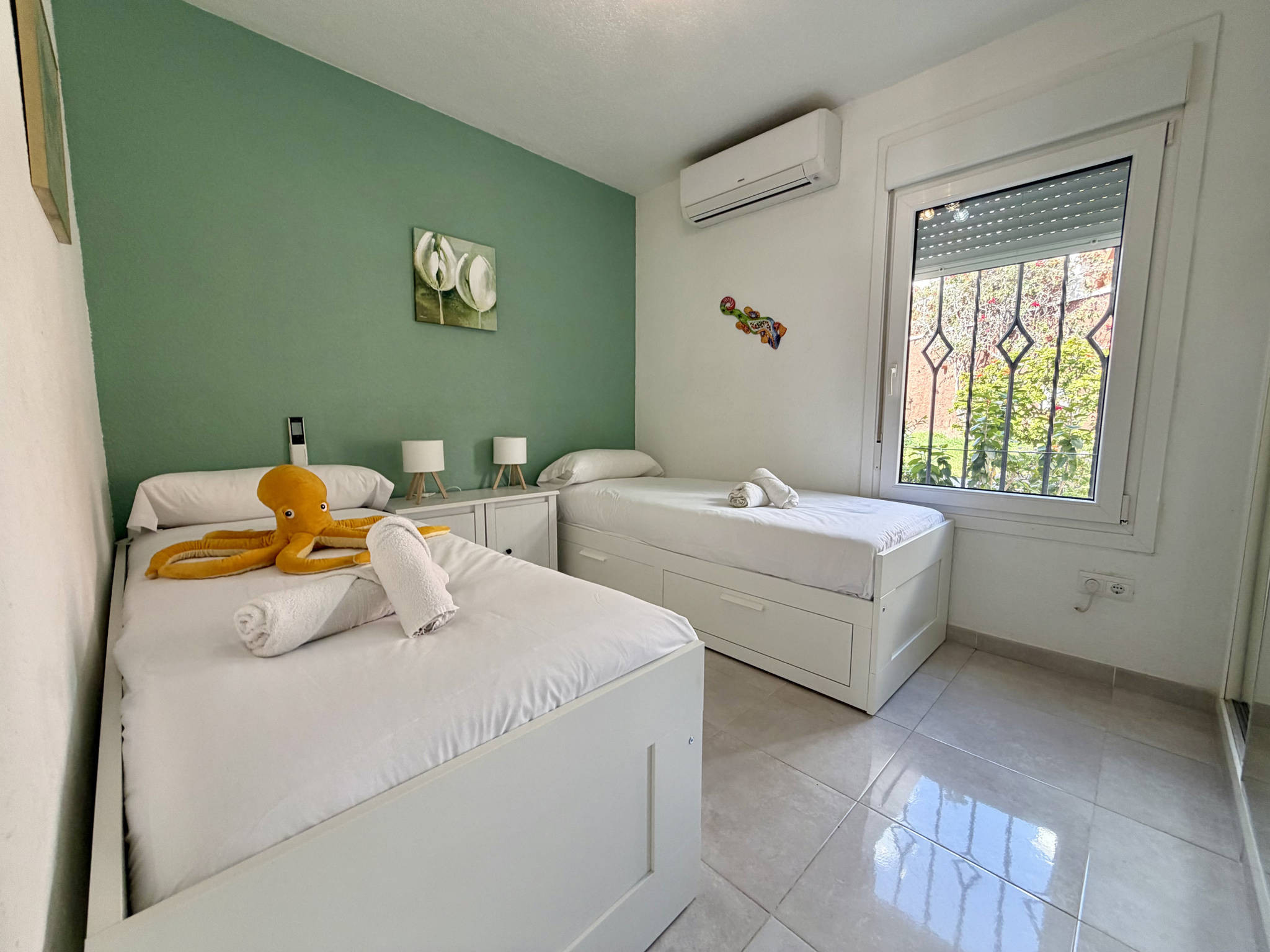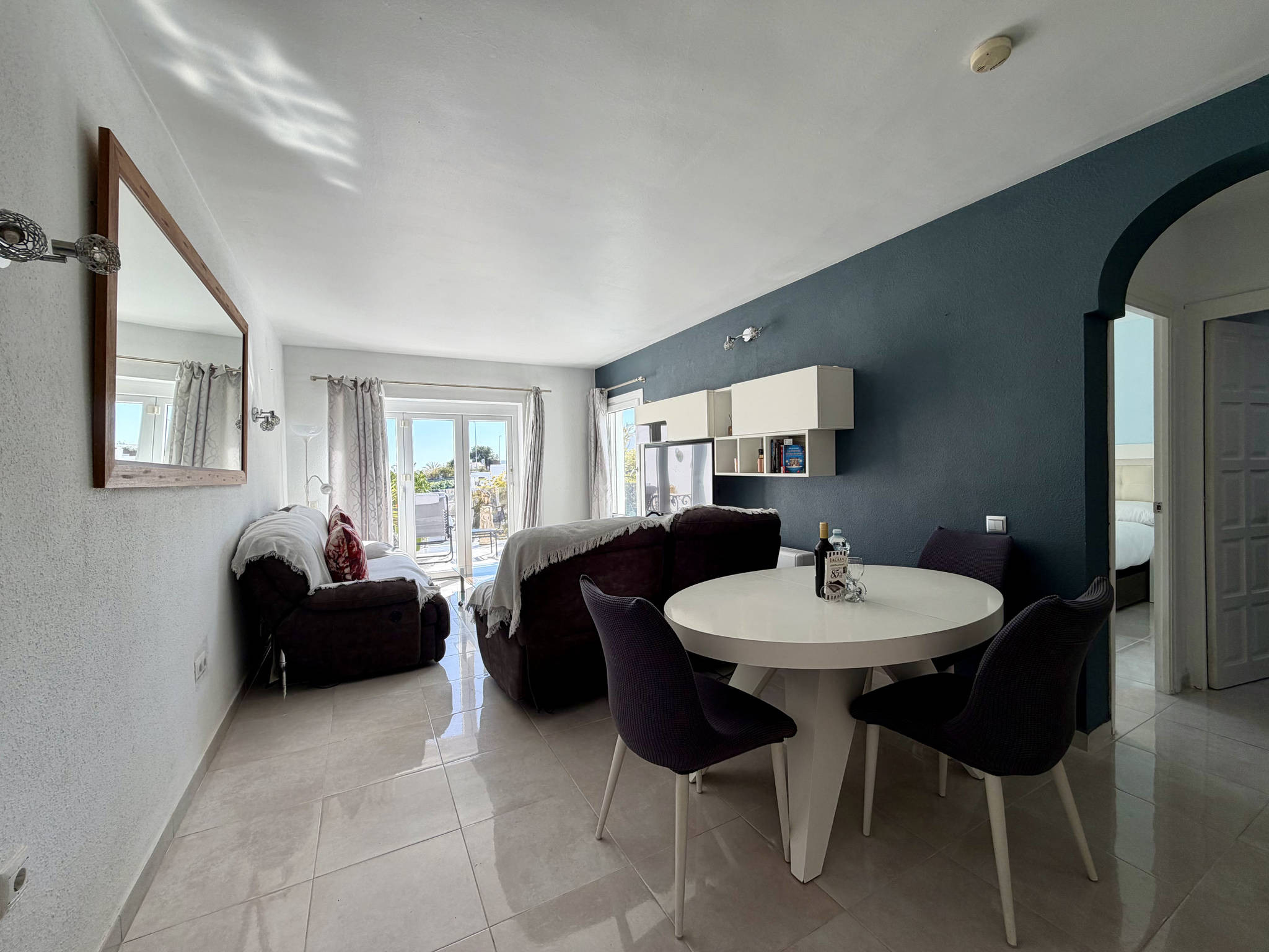 De woonkamer valt op door zijn praktische indeling, waarbij de geïntegreerde keuken een eigen, afgebakende ruimte heeft zonder barrières, wat de communicatie in huis vergemakkelijkt. De keuken is volledig uitgerust met een vaatwasser, zodat u geen tijd hoeft te verspillen aan huishoudelijke taken. De woon-eetkamer, met snelle wifi voor telewerken en televisie, staat in directe verbinding met de buitenruimte. De accommodatie heeft twee slaapkamers: één met een tweepersoonsbed en één met twee eenpersoonsbedden, plus een centrale badkamer met douche.Dubbel privéterras met barbecue en permanente zon
