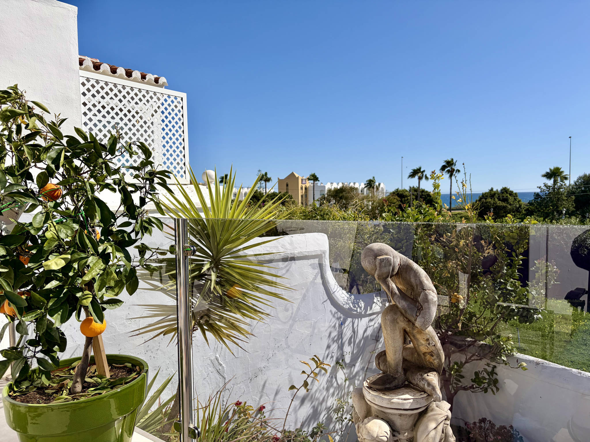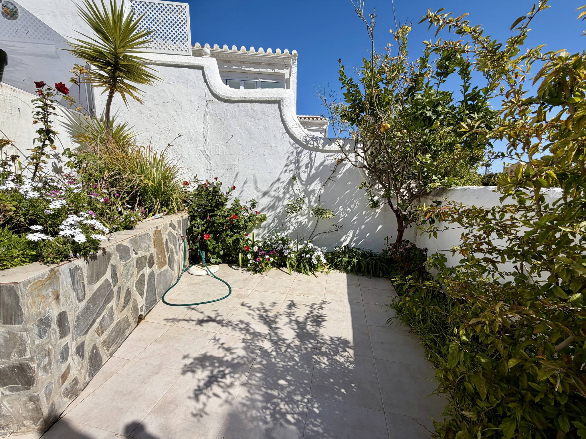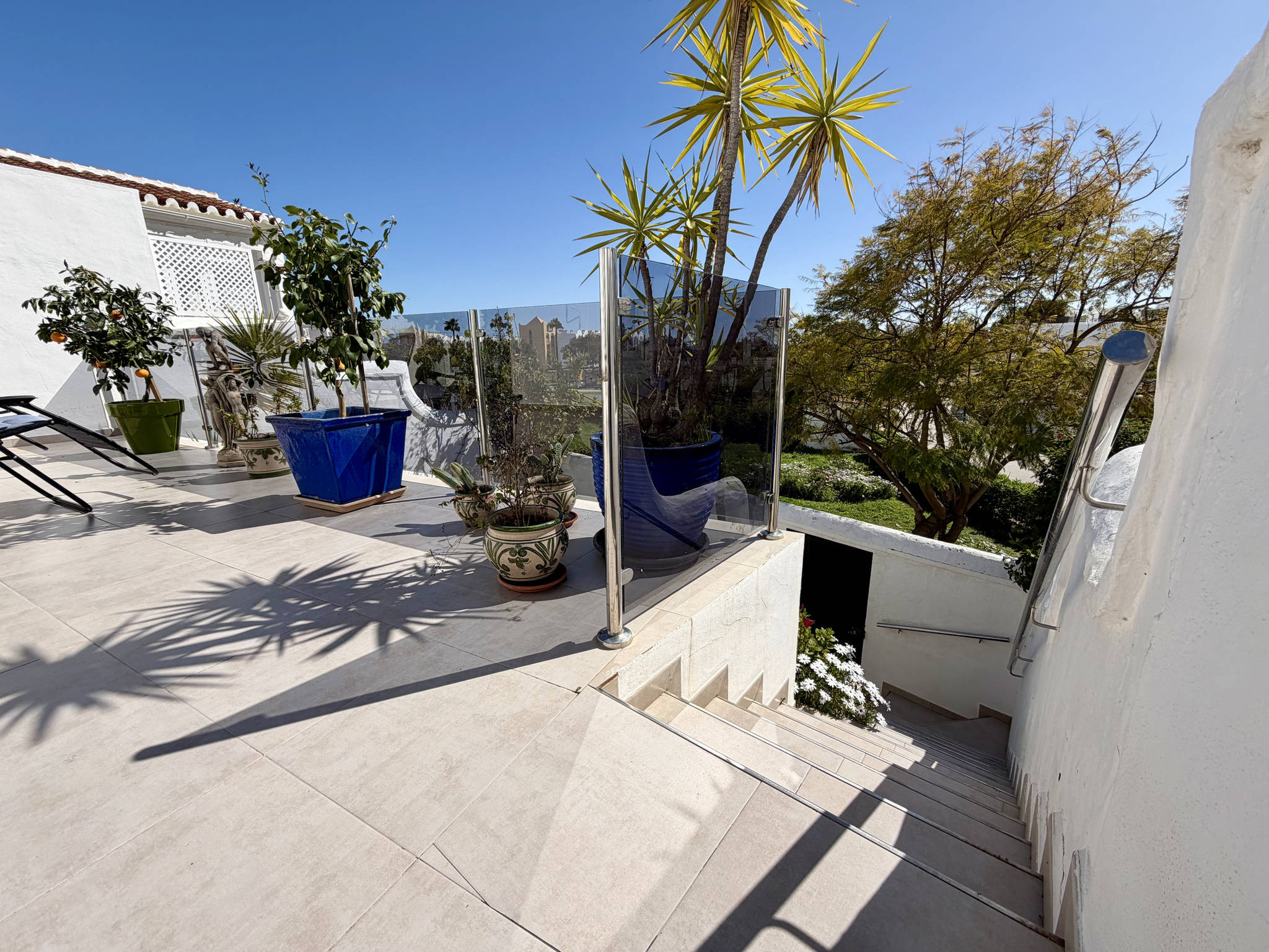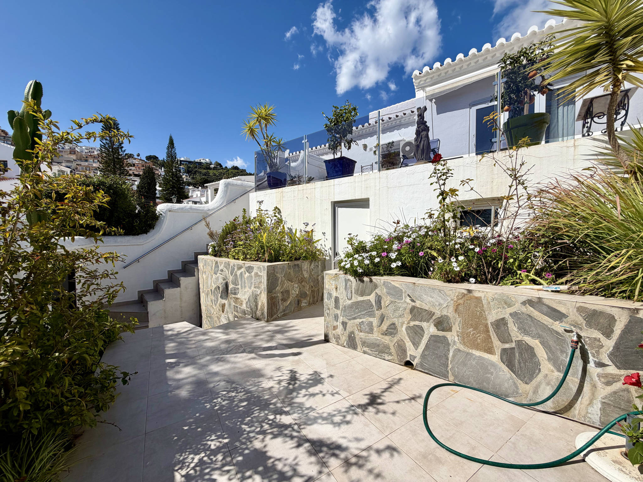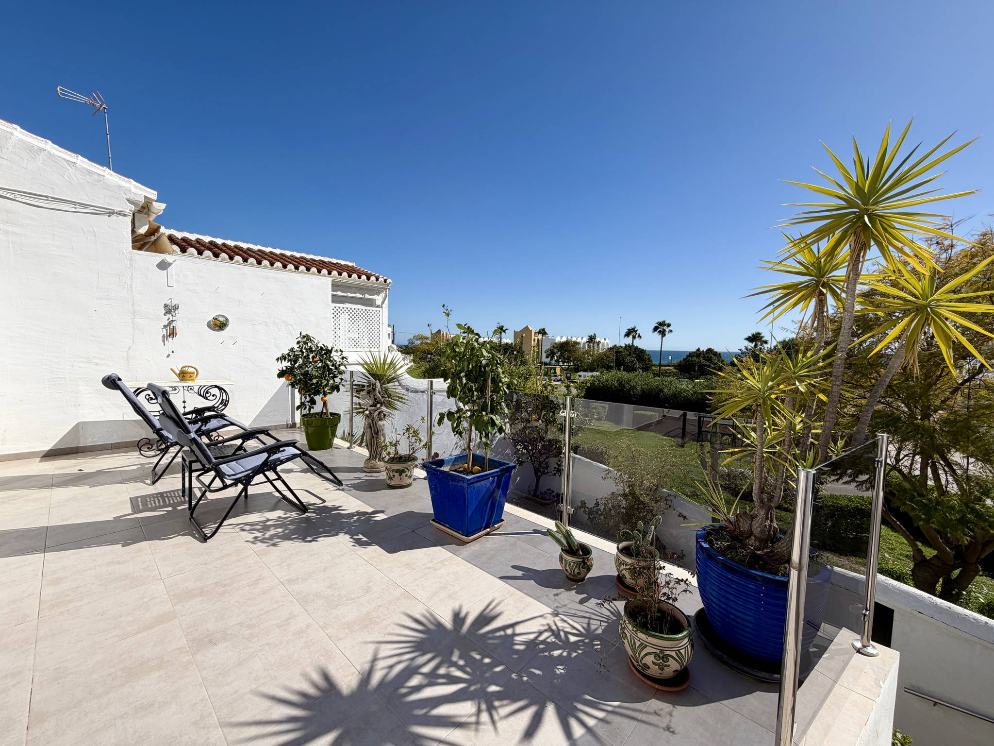 De grootste troef van dit appartement is de zeer ruime buitenruimte, verdeeld over verschillende niveaus die voor meer comfort met slechts een paar treden met elkaar zijn verbonden. Als u door de glazen deur van de woonkamer naar buiten gaat, komt u op het hoofdniveau met ligstoelen om te ontspannen met uitzicht op zee en, direct rechts in deze ruimte, een zone met een grote tafel en barbecue om te genieten van diners in de open lucht. Een paar treden lager komt u op een tweede niveau dat omgeven is door bloemen, een ideale plek om van de rust te genieten. Nog een paar treden lager bevindt zich het onderste niveau, waar een aparte kamer met de wasmachine en een strategische tweede ingang te vinden zijn.Strategische toegang en diensten van de urbanisatie
