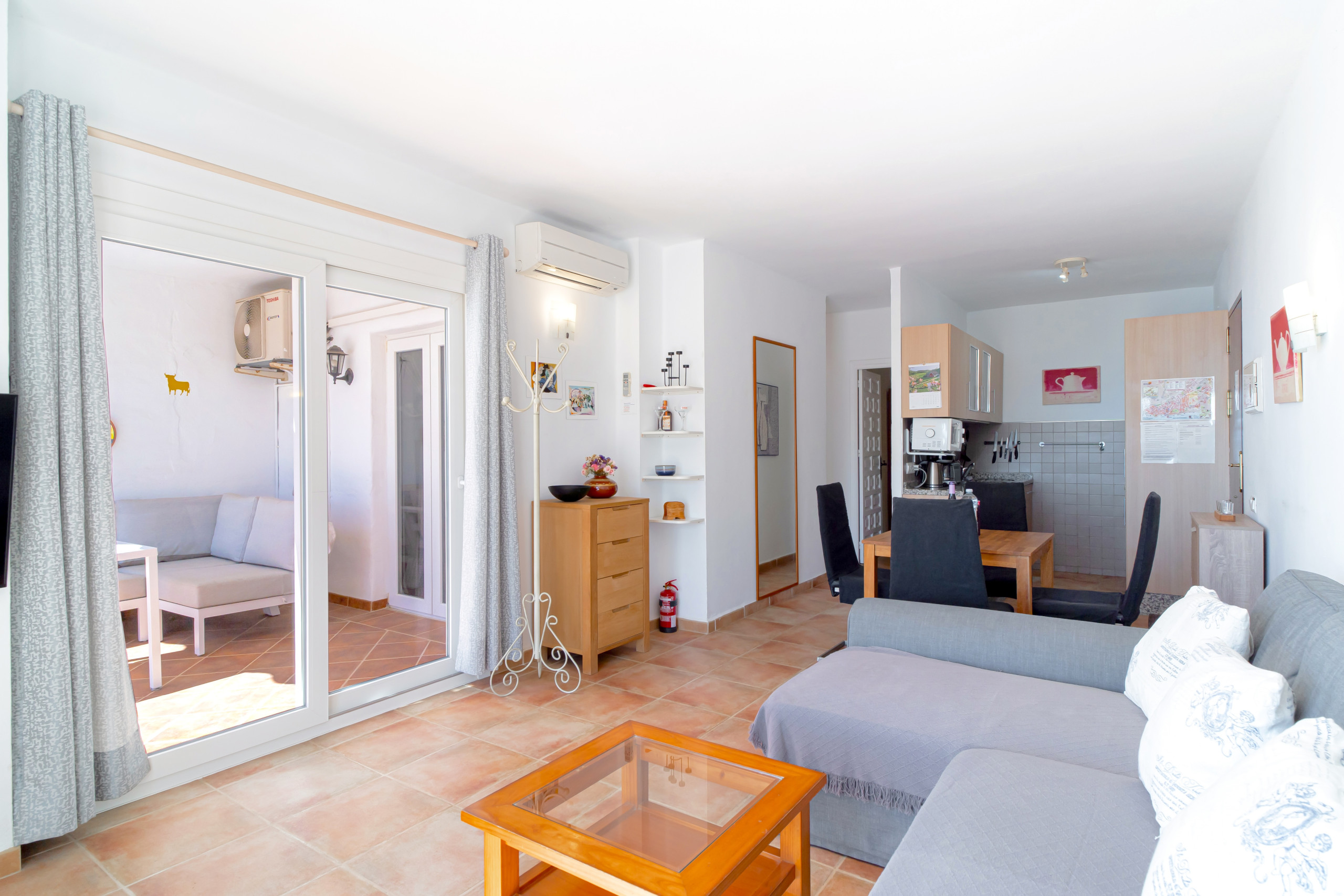 De woonkamer is licht en smaakvol ingericht, naadloos verbonden met het terras en biedt een gezellige plek om te ontspannen. In de volledig uitgeruste keuken kunt u uw favoriete maaltijden bereiden om binnen of buiten te genieten.