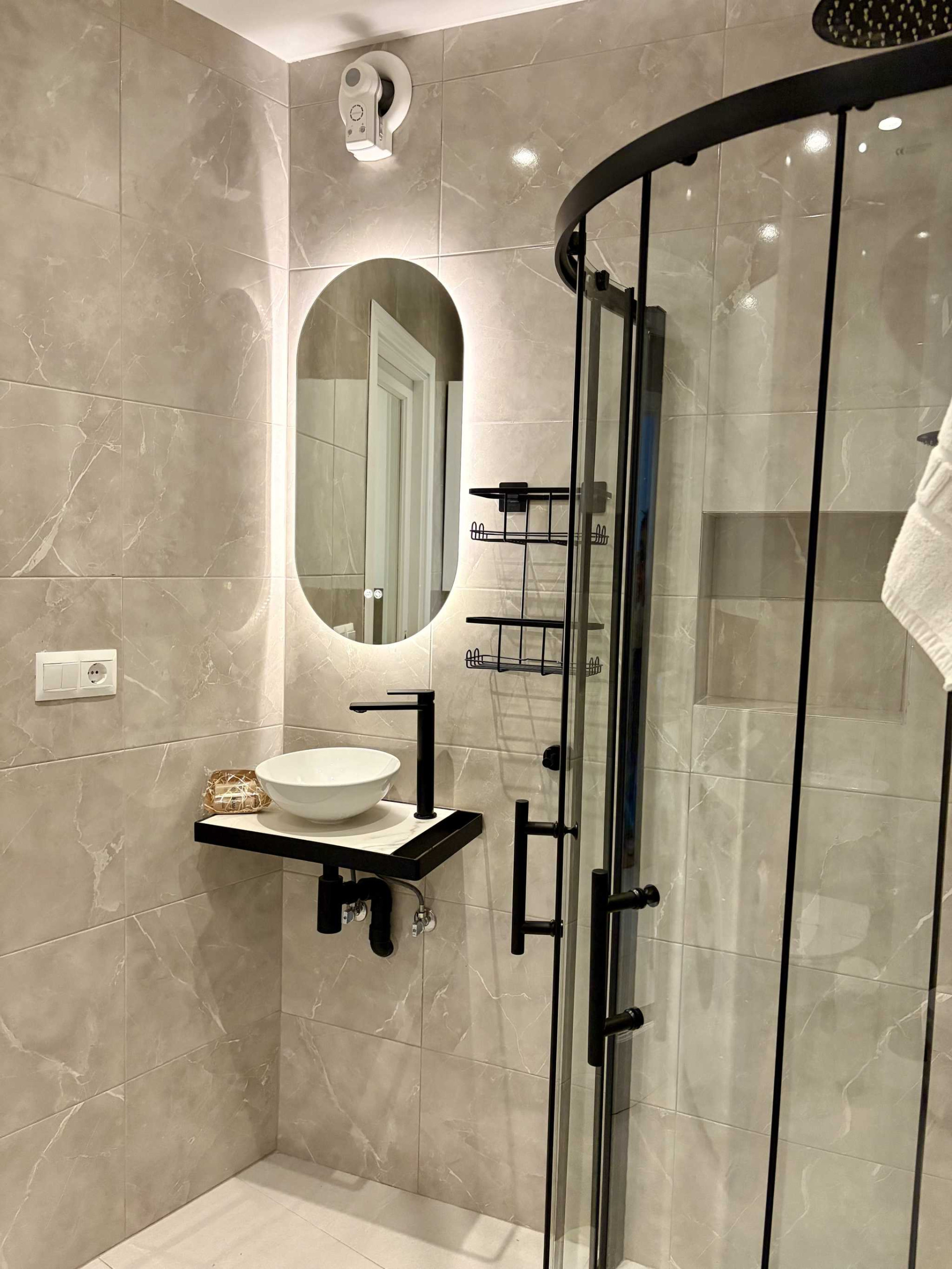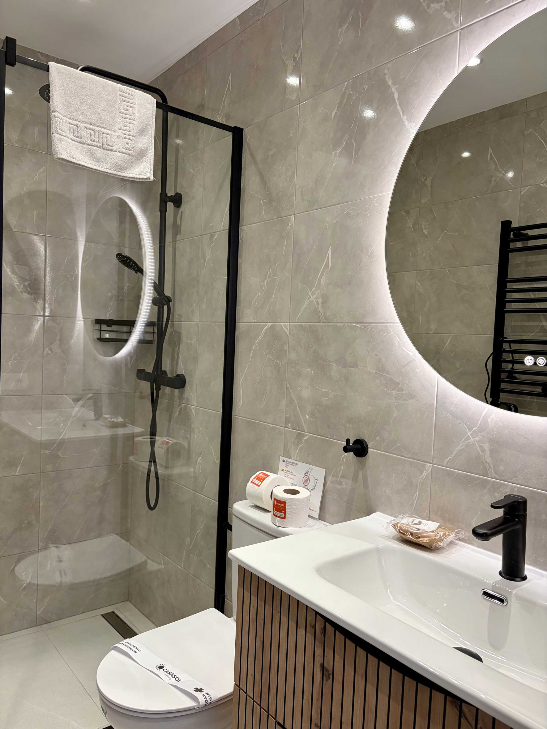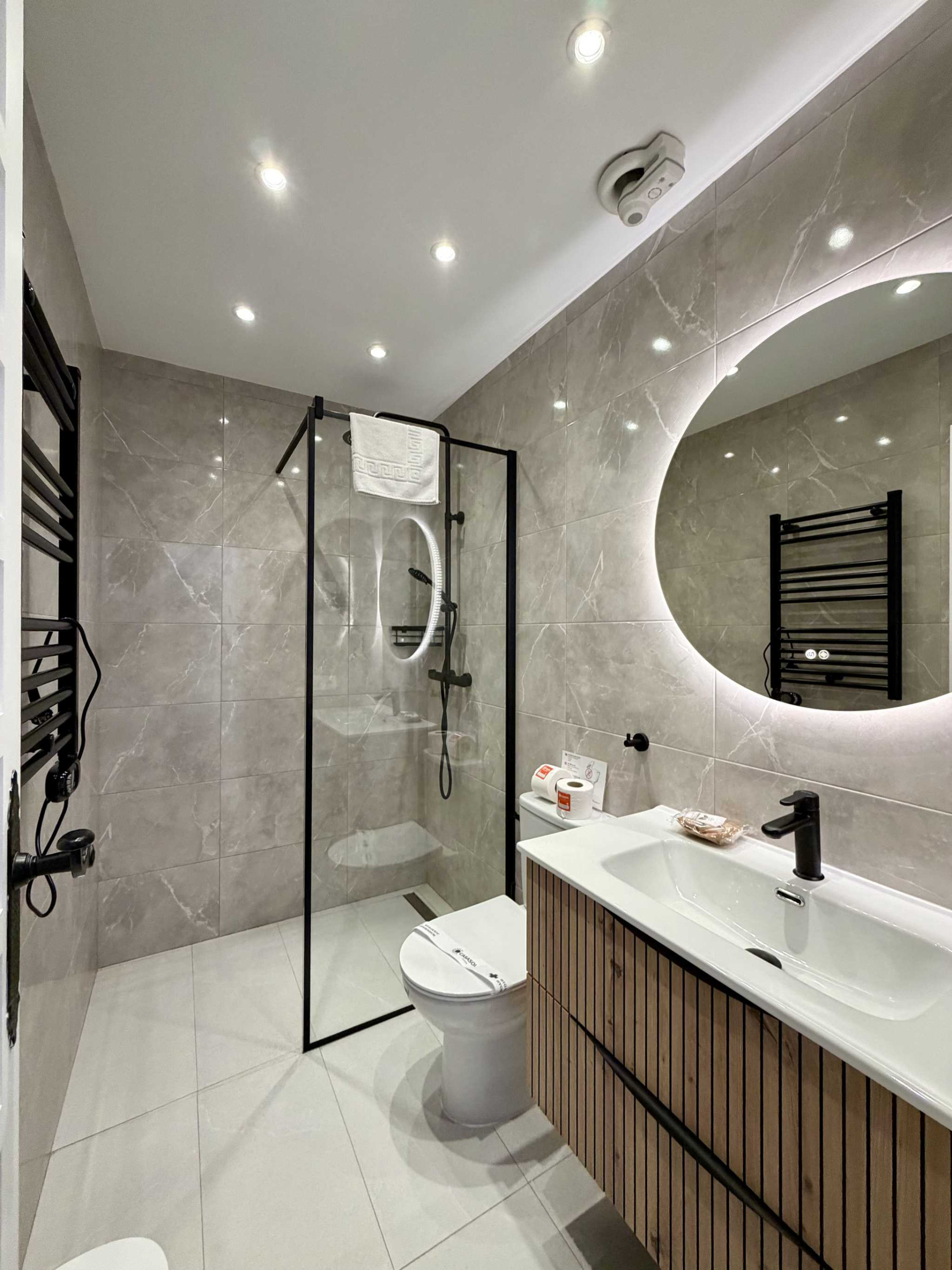 - Een tweede moderne badkamer toegankelijk vanuit de gang met douche, toilet en elegante afwerking.