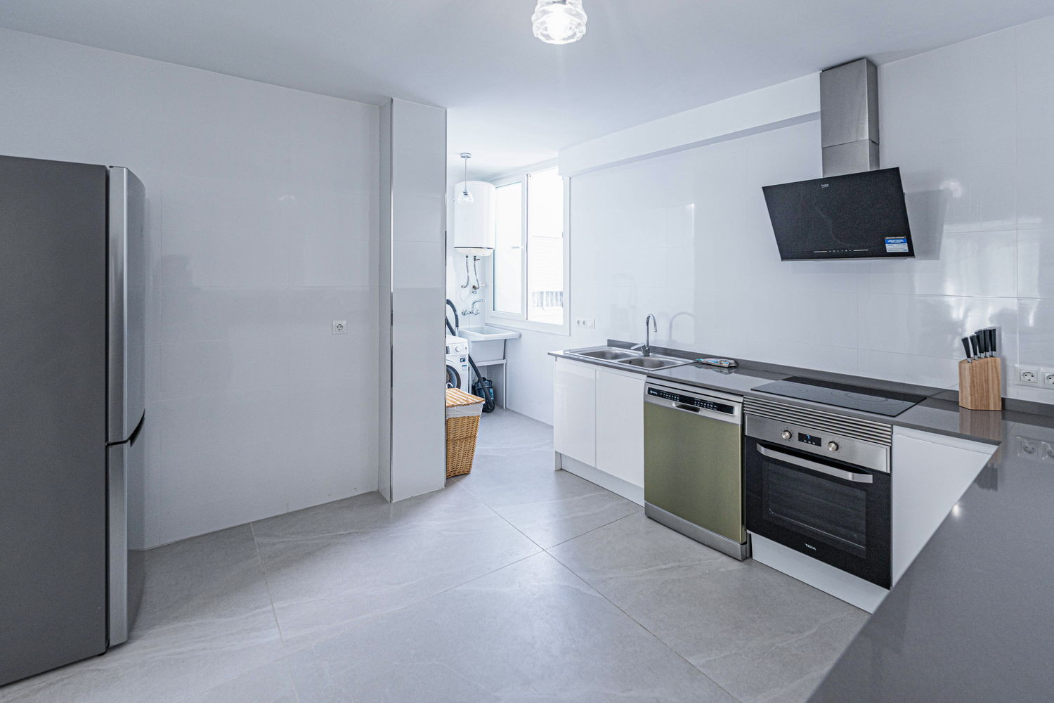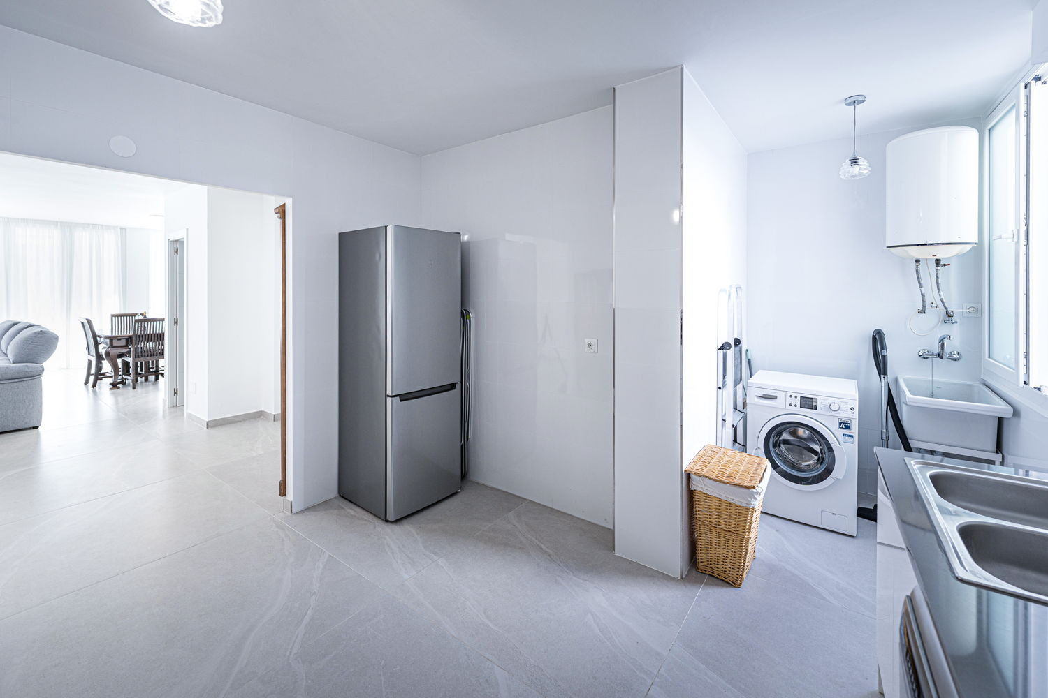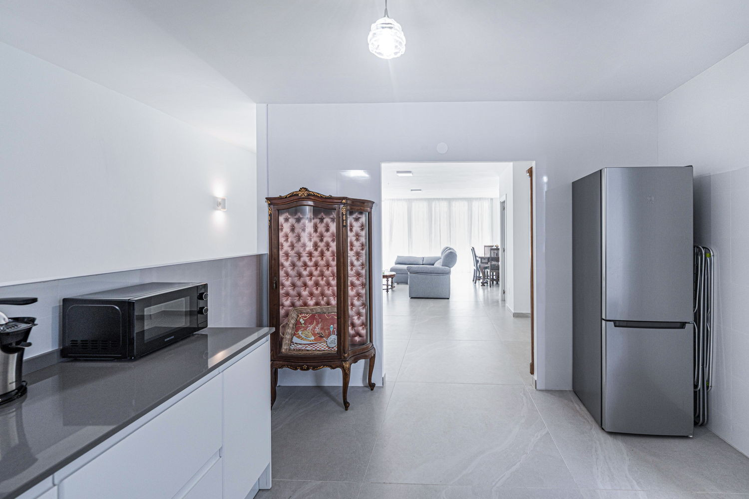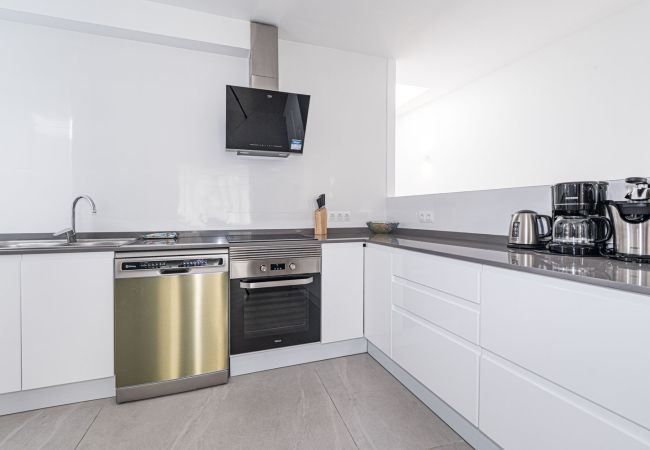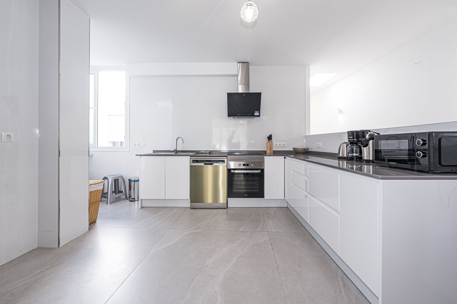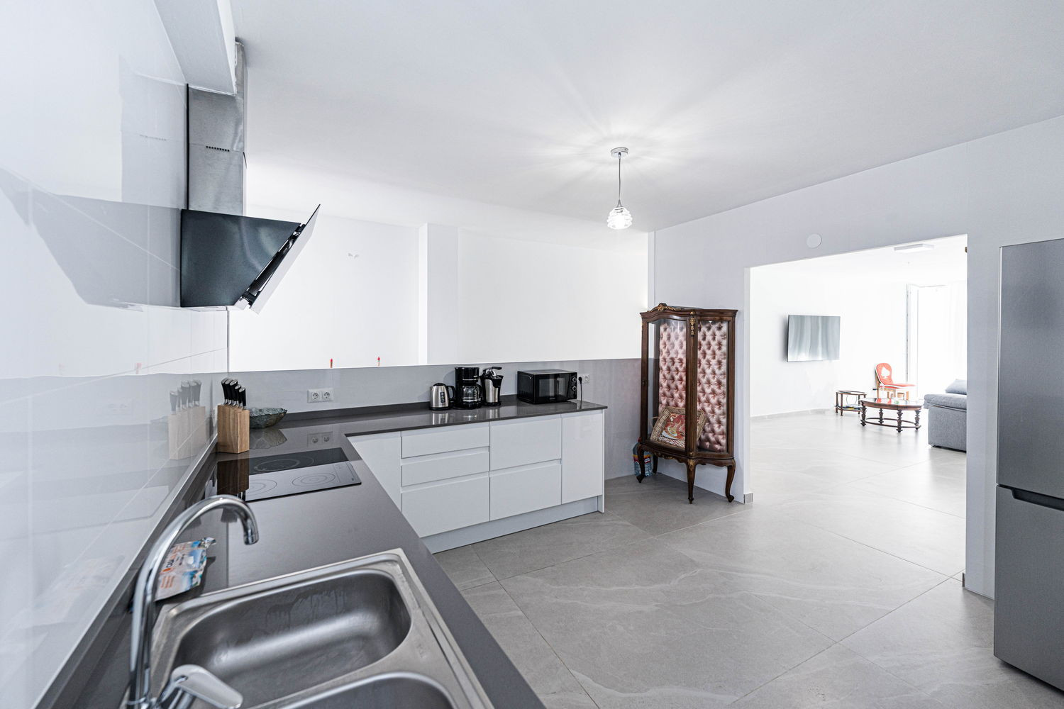 Binnen- en buitenleven: Het hart van het huis is een uitzonderlijk ruime en lichte woonkamer, die direct in verbinding staat met het terras aan de hoofdstraat. Hierdoor kan de bries uit het centrum de hele ruimte verfrissen. De keuken is voorzien van hoogwaardige apparatuur en is volledig uitgerust met alles wat u nodig heeft voor uw verblijf, inclusief vaatwasser, oven en magnetron. Het is een functionele en moderne ruimte, ideaal voor het bereiden van een snelle kop koffie voordat u naar het strand gaat, tot een complete maaltijd met het hele gezin.