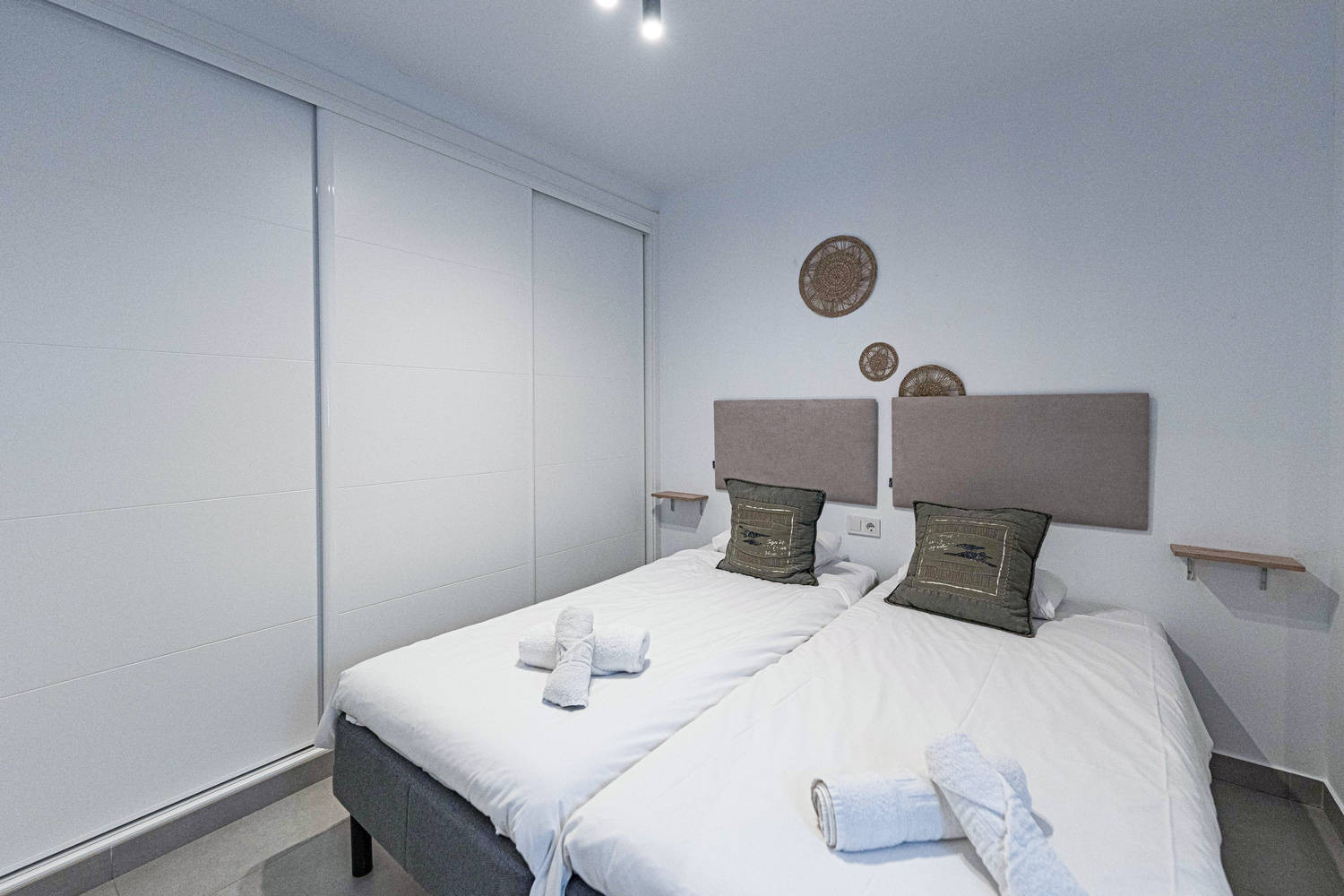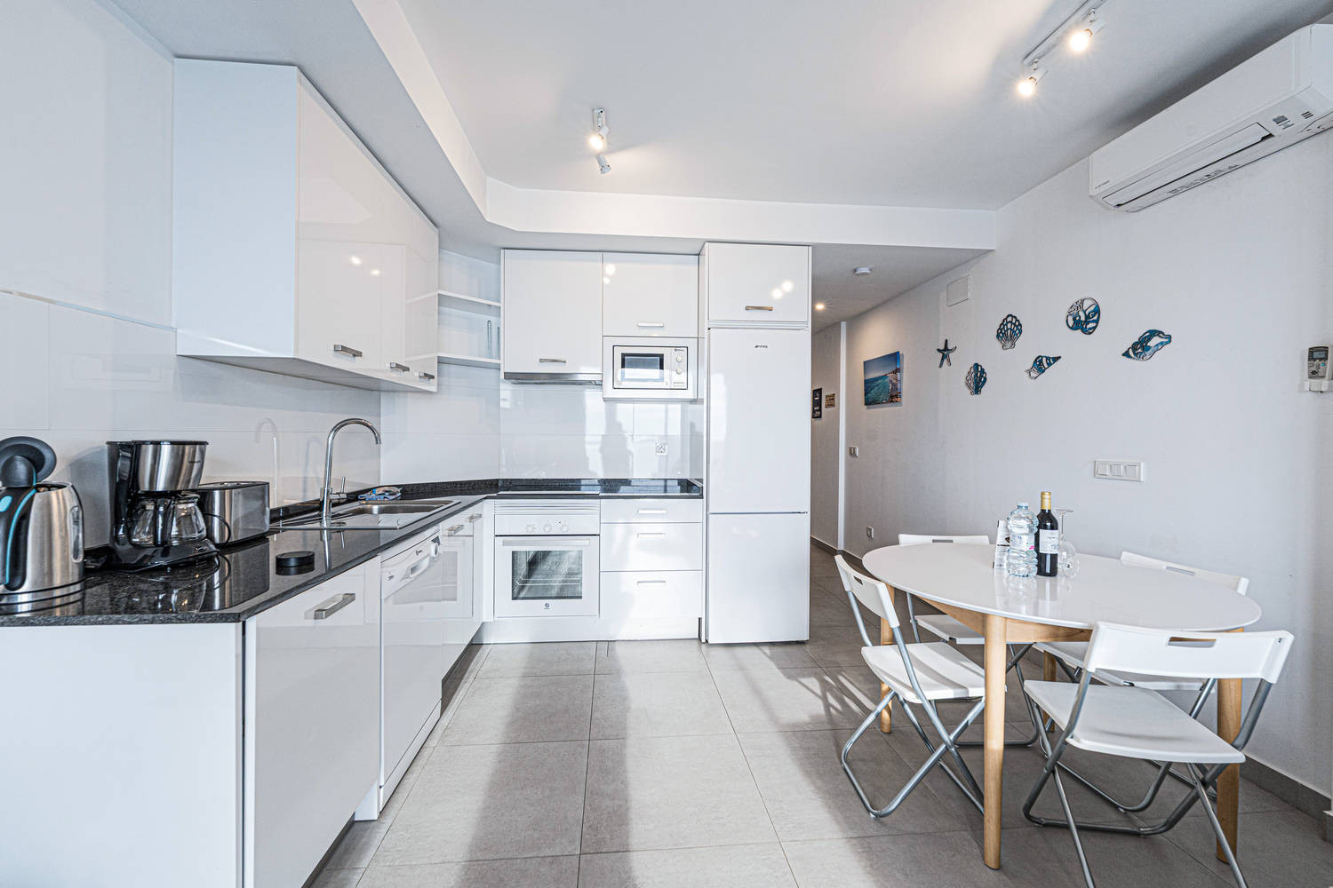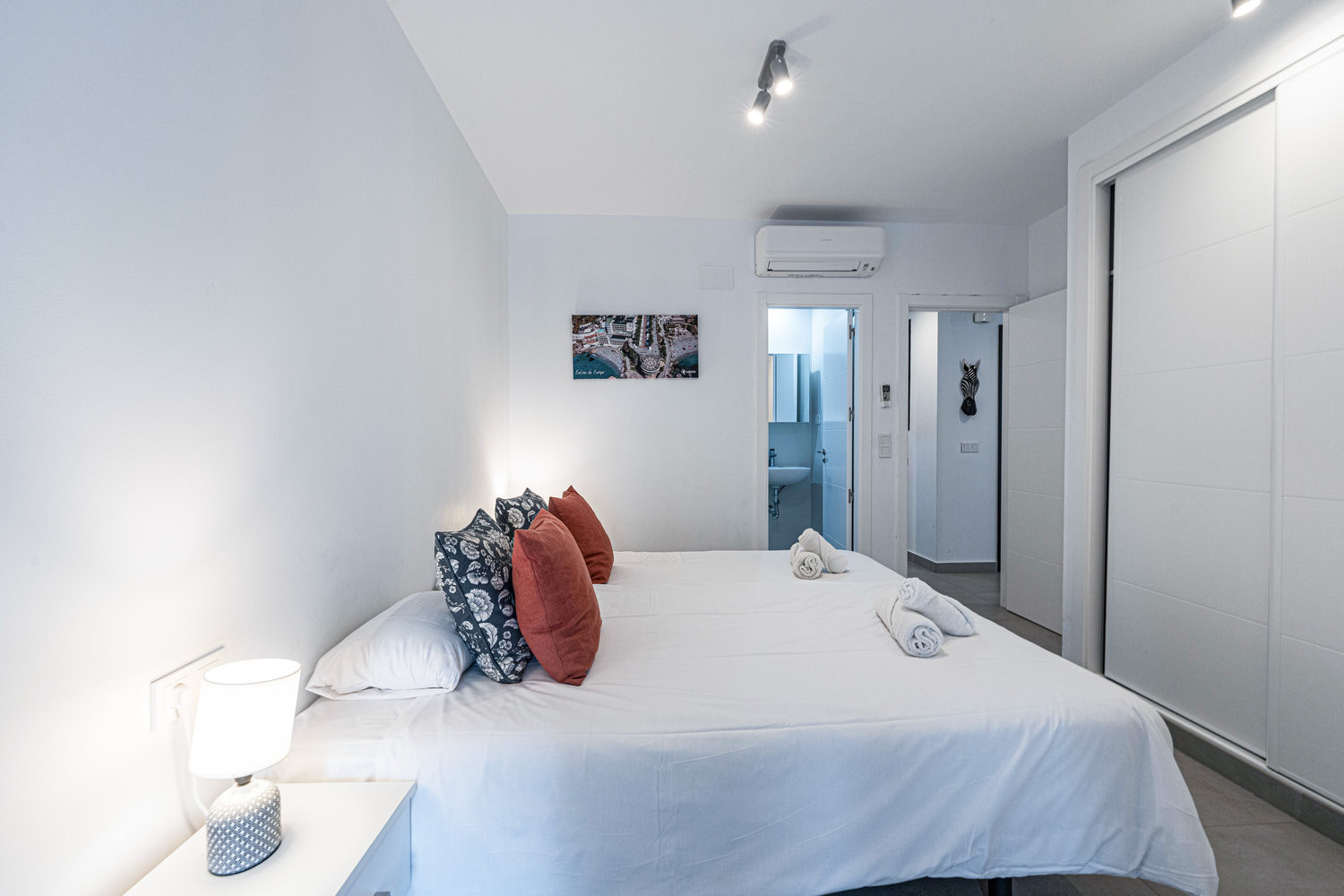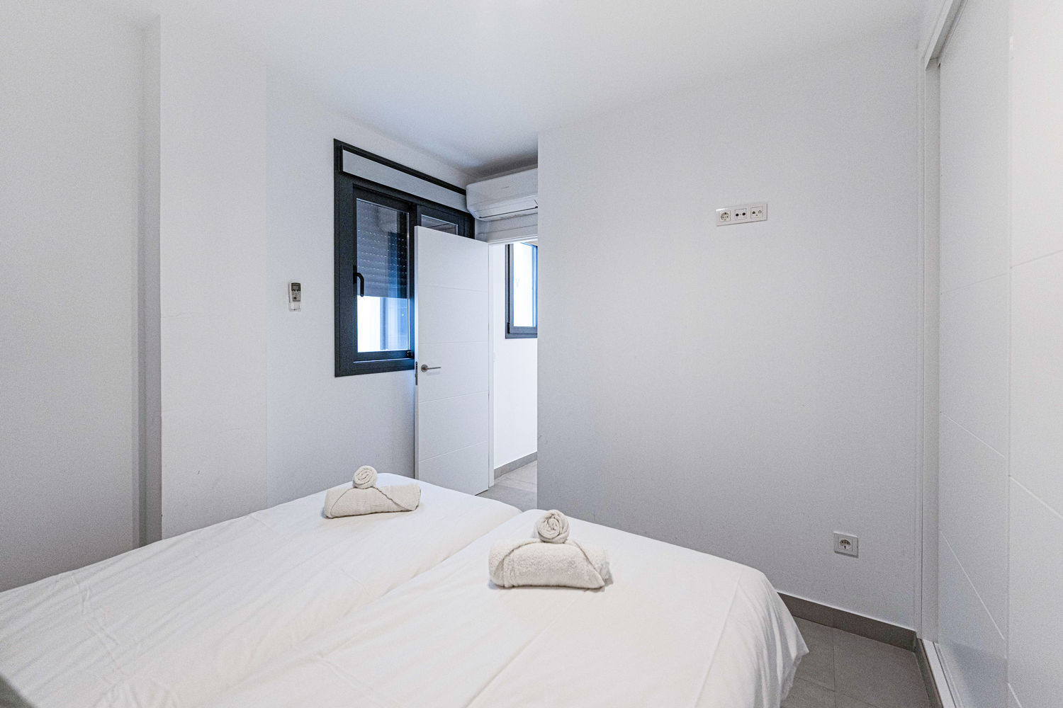 De flat heeft twee slaapkamers en twee badkamers: een met een kingsize bed en eigen badkamer, en een andere slaapkamer met een stapelbed. Het heeft ook een volledig uitgeruste moderne keuken met de modernste apparatuur, perfect om je thuis te voelen tijdens je vakantie.
