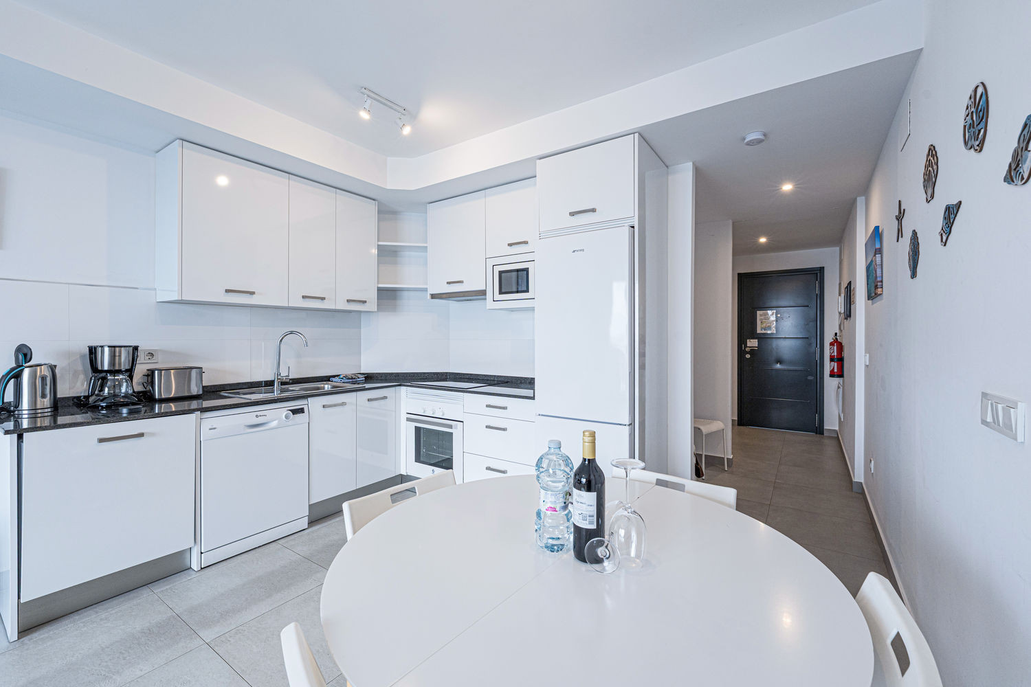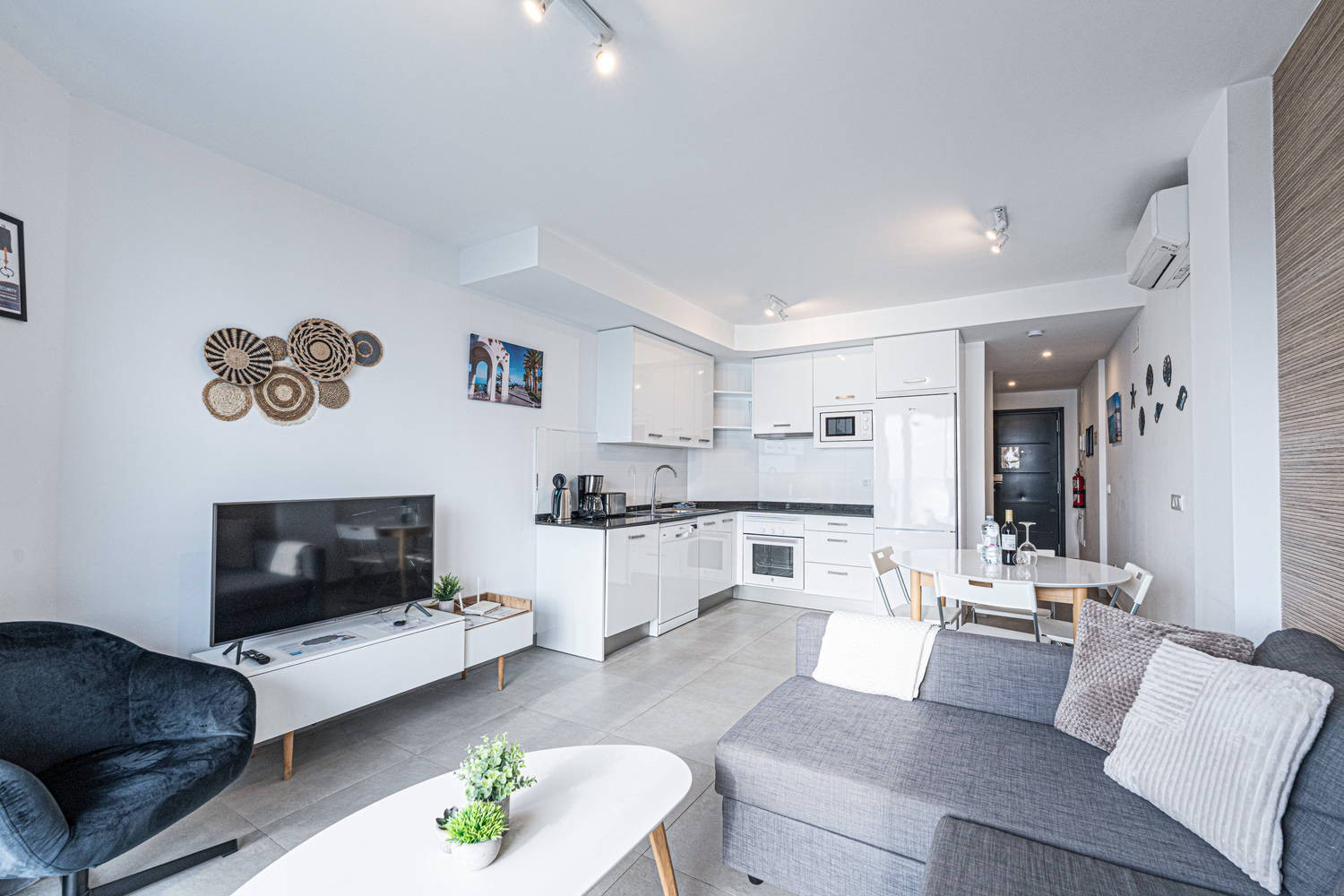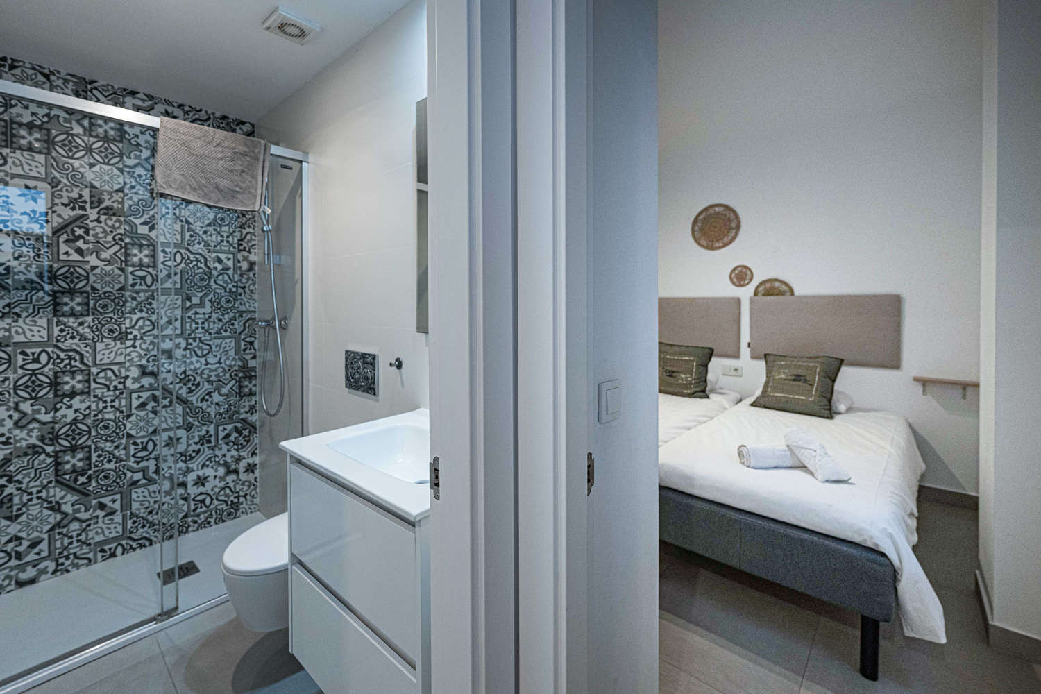 De flat heeft twee slaapkamers en twee badkamers: een met een kingsize bed en eigen badkamer, en een andere slaapkamer met een stapelbed. Het heeft ook een volledig uitgeruste moderne keuken met de modernste apparatuur, perfect om je thuis te voelen tijdens je vakantie.