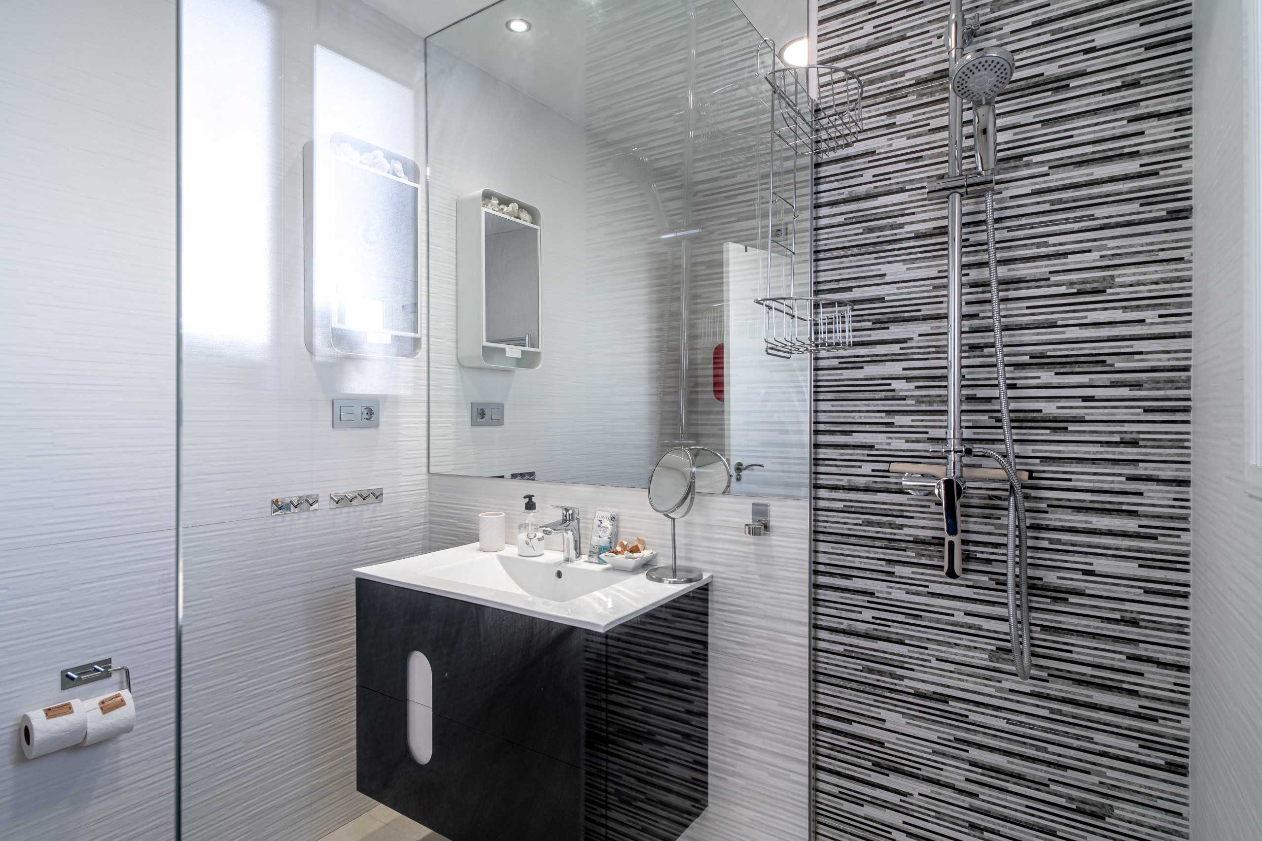 De ingang van de flat is op straatniveau, waardoor de toegang gemakkelijk is, en er is altijd een openbare parkeerplaats bij de hand in de directe omgeving van de villa, zelfs in het hoogseizoen. Op slechts 150 meter afstand ligt een goed onderhouden gemeenschappelijk zwembad met ligbedden en parasols, ideaal om te ontspannen en van de zon te genieten.