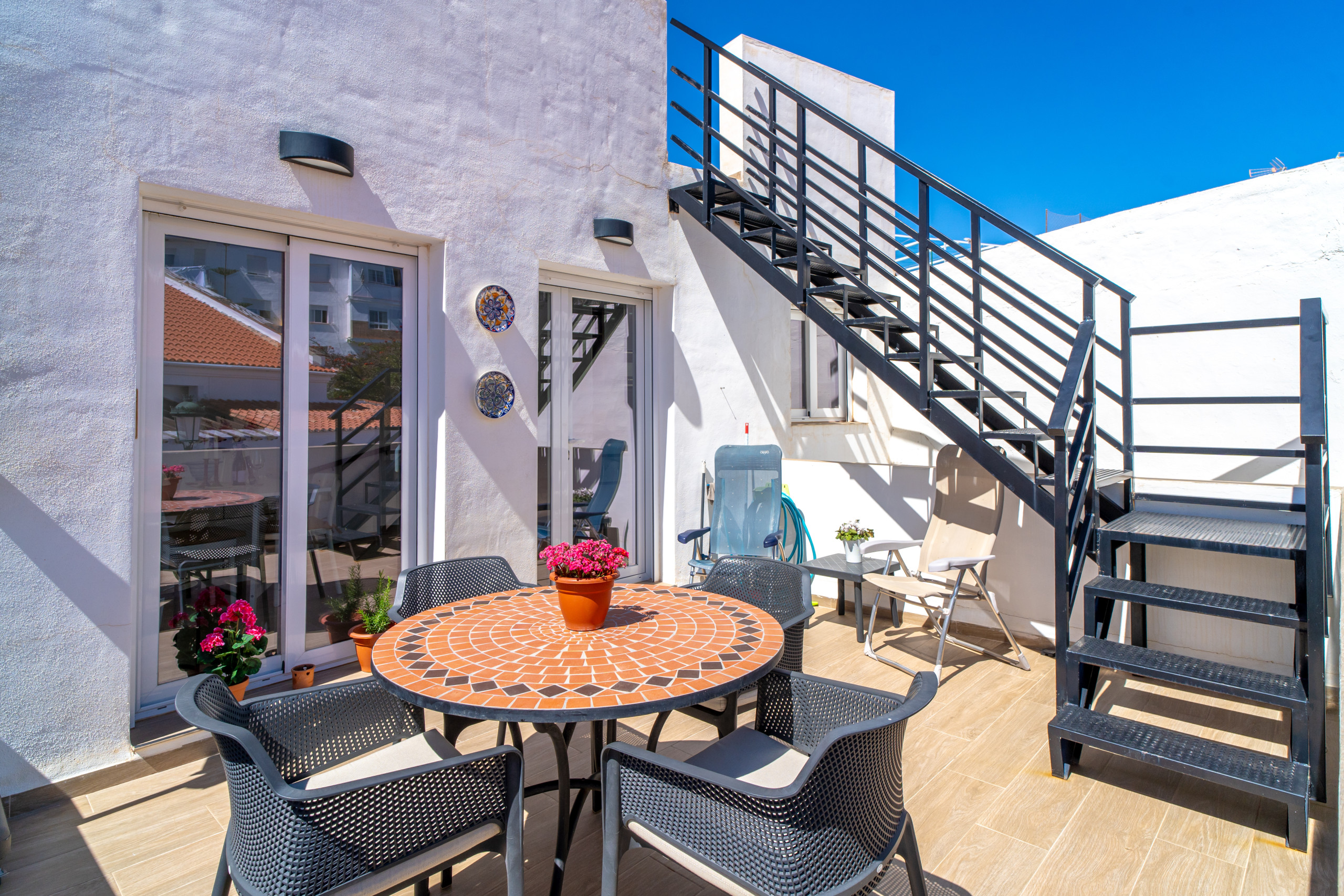 - Eerste terras met tafel, stoelen en parasol, ideaal voor ontbijt in de zon of dineren in de buitenlucht.