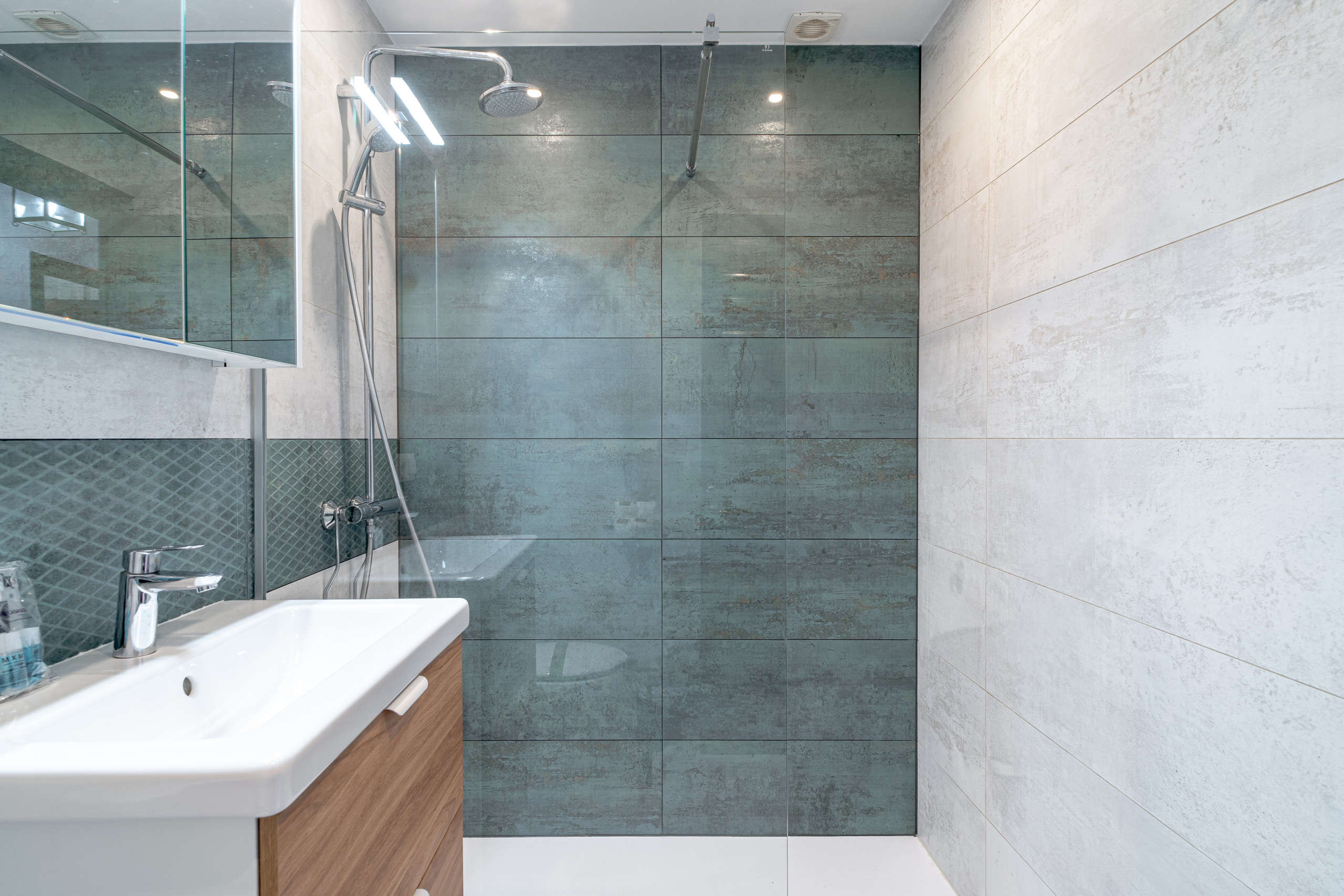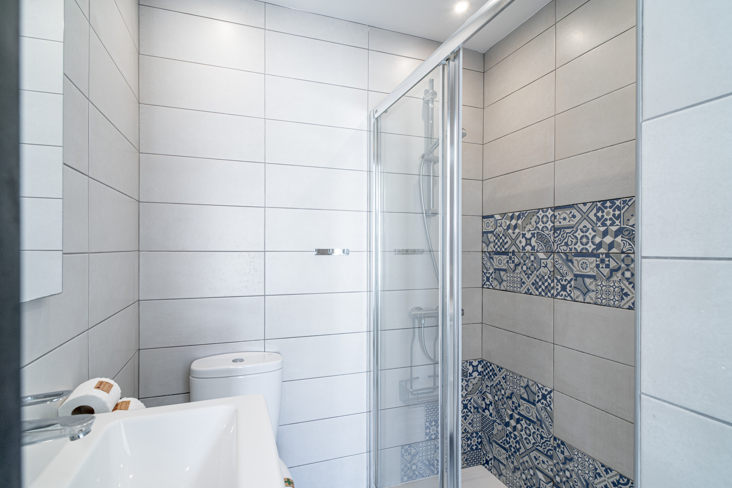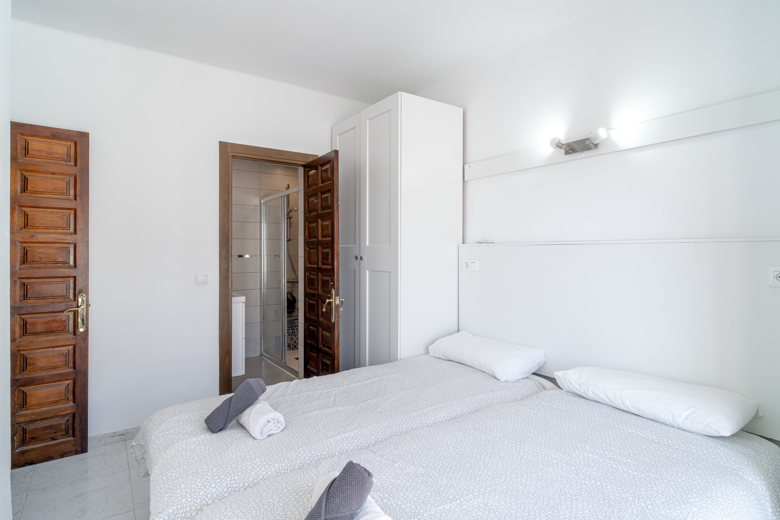 Een derde slaapkamer met tweepersoonsbed en en-suite badkamer bevindt zich op de benedenverdieping en biedt iets meer privacy en rust, omdat het een aparte ingang heeft via het beneden terras.