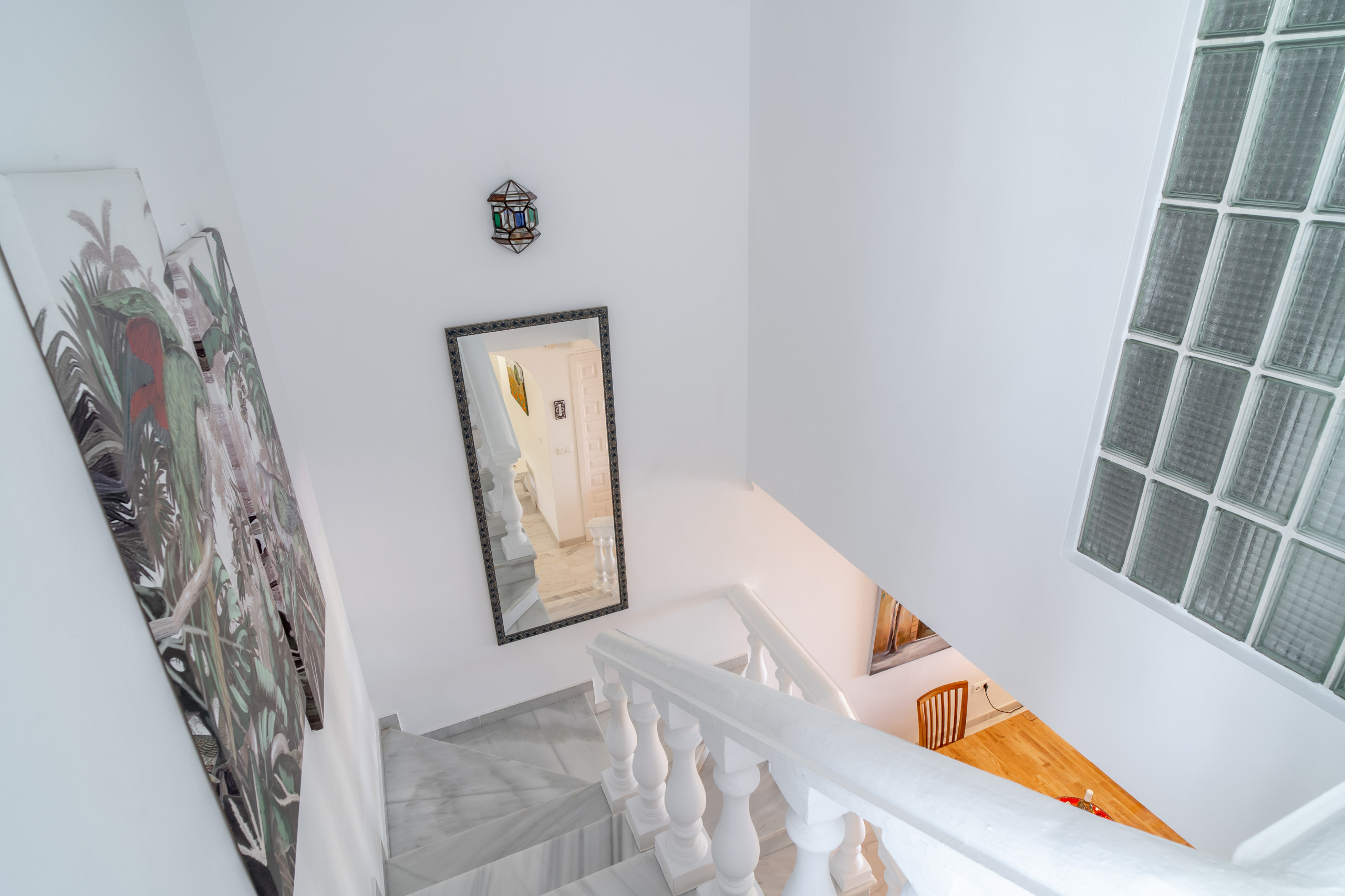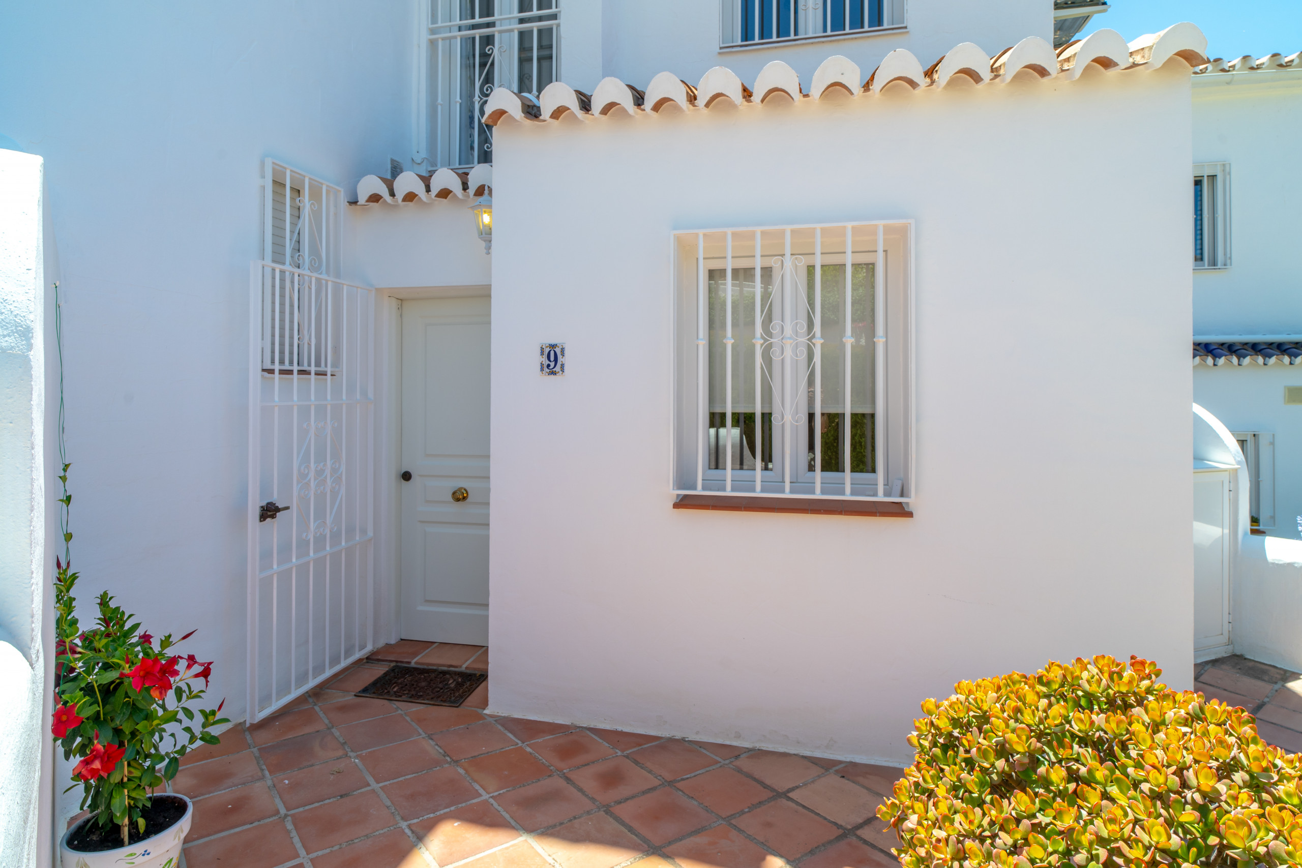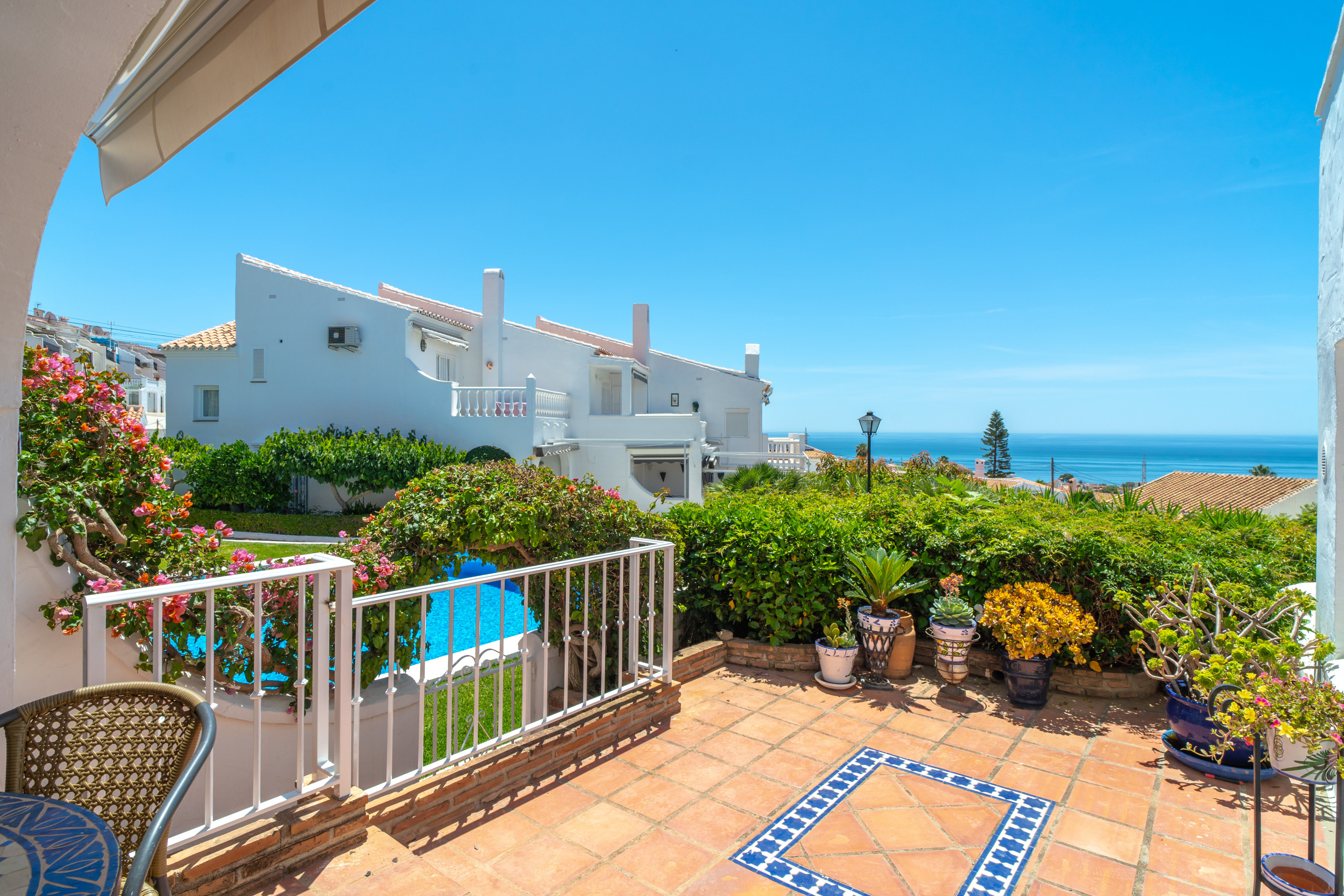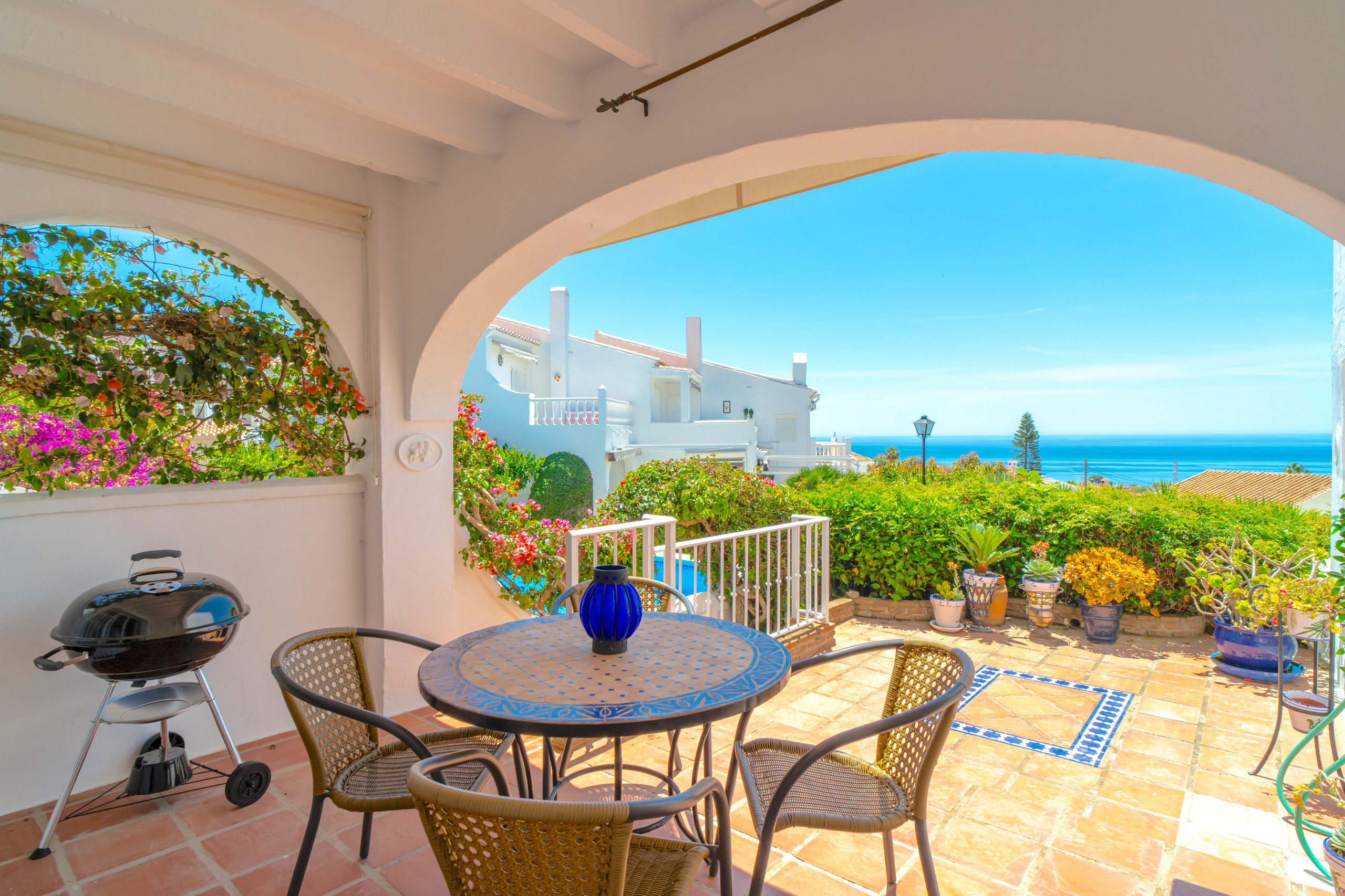 Het pand beschikt over een gezellig, gedeeltelijk overdekt terras op de begane grond, een ideale ruimte om te genieten van een schaduwrijke lunch, al fresco te dineren of gewoon te ontspannen met een glas wijn terwijl je geniet van het uitzicht. Dit terras heeft ook een eigen kleine privétuin met potplanten, bougainville, hibiscus en jasmijn, die een perfecte aanvulling vormt op de weelderige gemeenschappelijke tuin die het pand omringt.