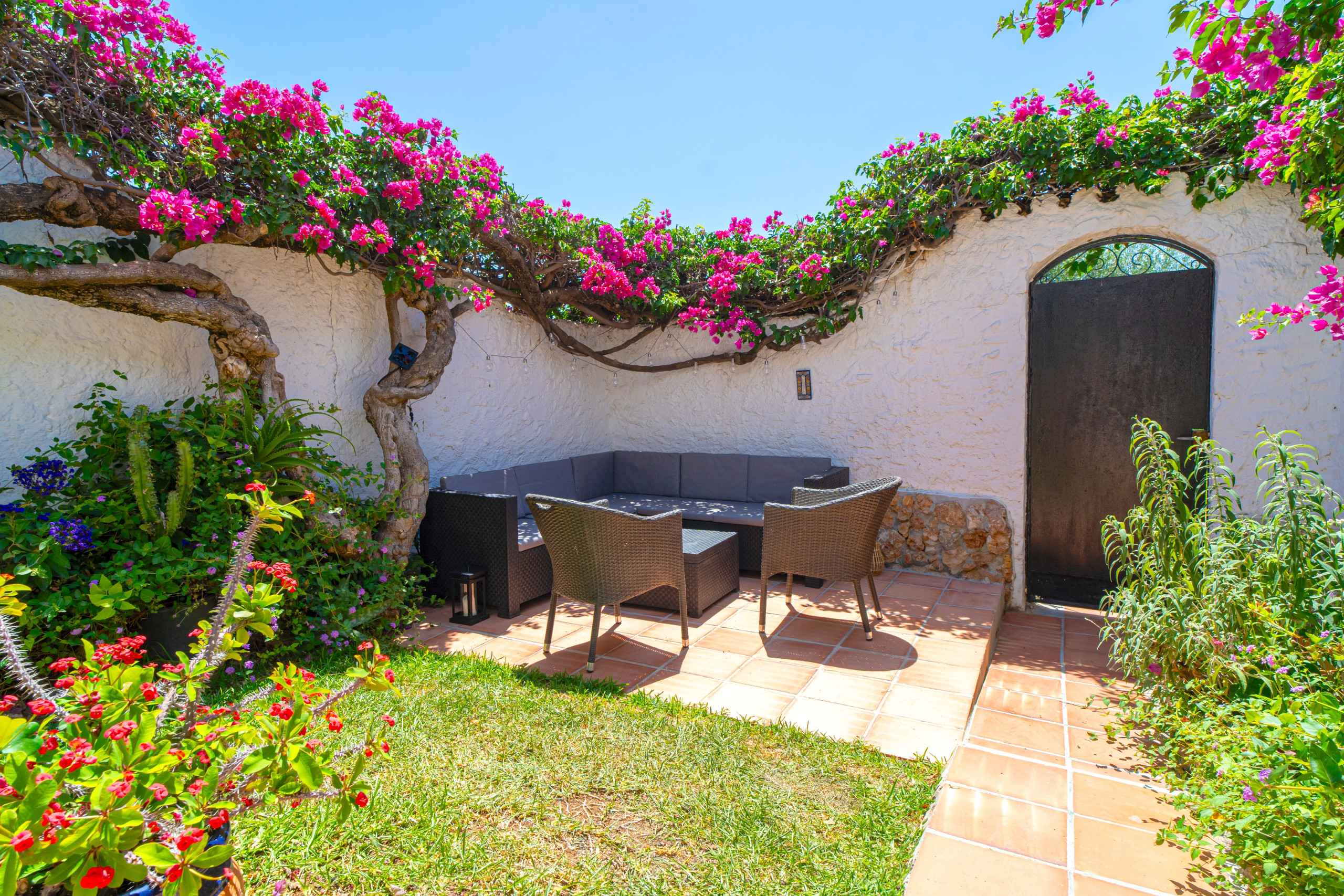 Vanuit de woonkamer stap je zo het terras op, dat op het zuiden ligt en is ingericht met een eethoek en ligstoelen – een perfecte plek om buiten te eten of gewoon lekker van de zon te genieten. Een paar treden lager kom je in een gezellige zithoek, omringd door kleurrijke bougainvilles en weelderige tuinbloemen, die een rustige en uitnodigende plek vormen om even tot rust te komen.