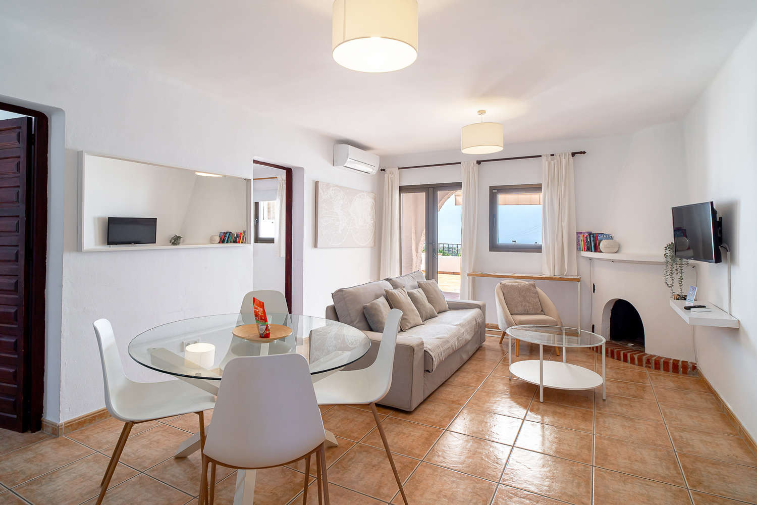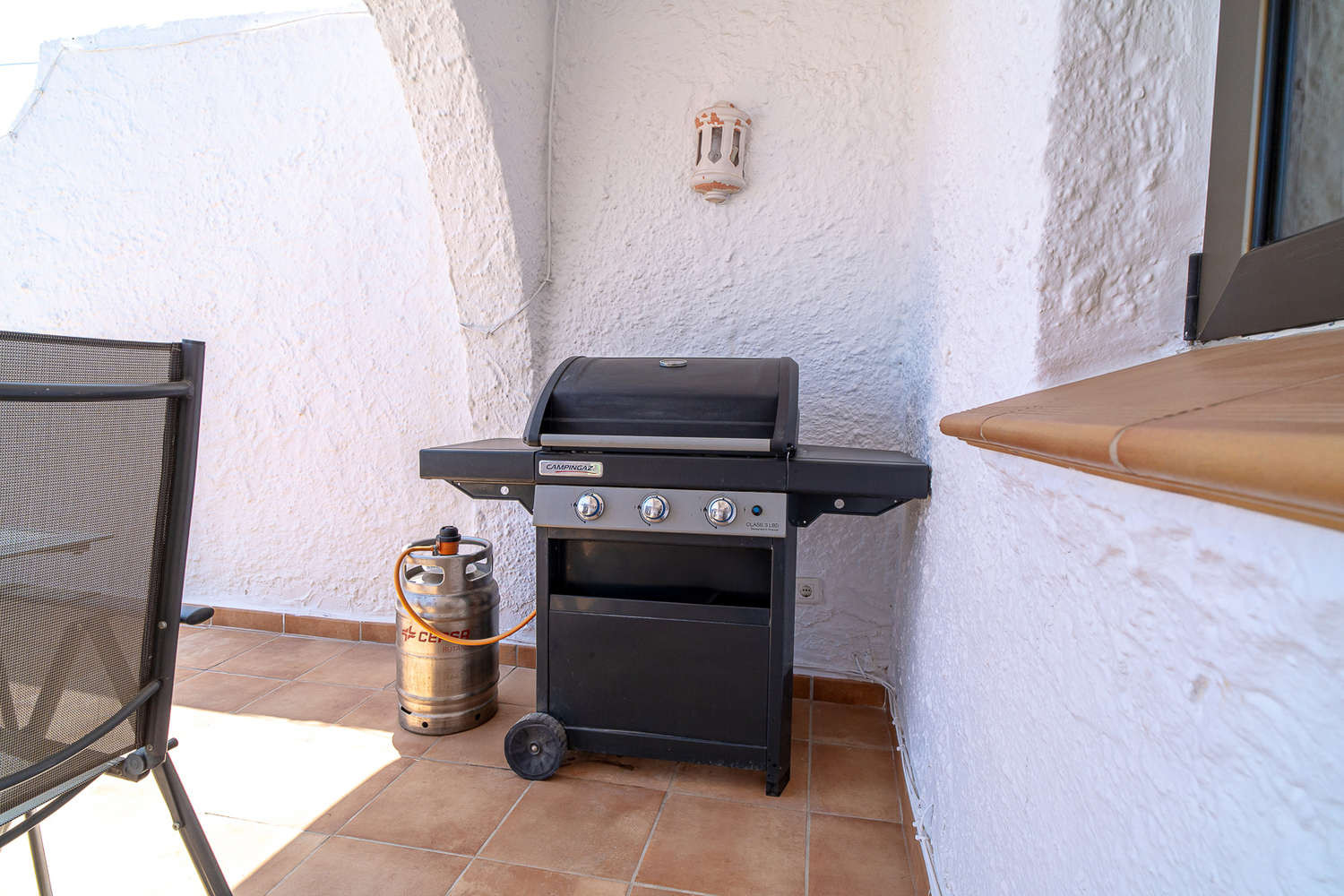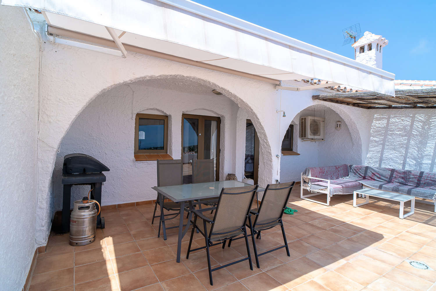 Binnen- en buitenleven: De woning komt uit op een groot terras op het zuiden van ongeveer 30 m², dat toegankelijk is vanuit de woonkamer en de hoofdslaapkamer. Een ideale plek om het grootste deel van de dag van de zon te genieten, met een eethoek buiten, ligstoelen en een gasbarbecue, waarbij zonnige en gedeeltelijk overdekte zones worden gecombineerd voor meer comfort.
