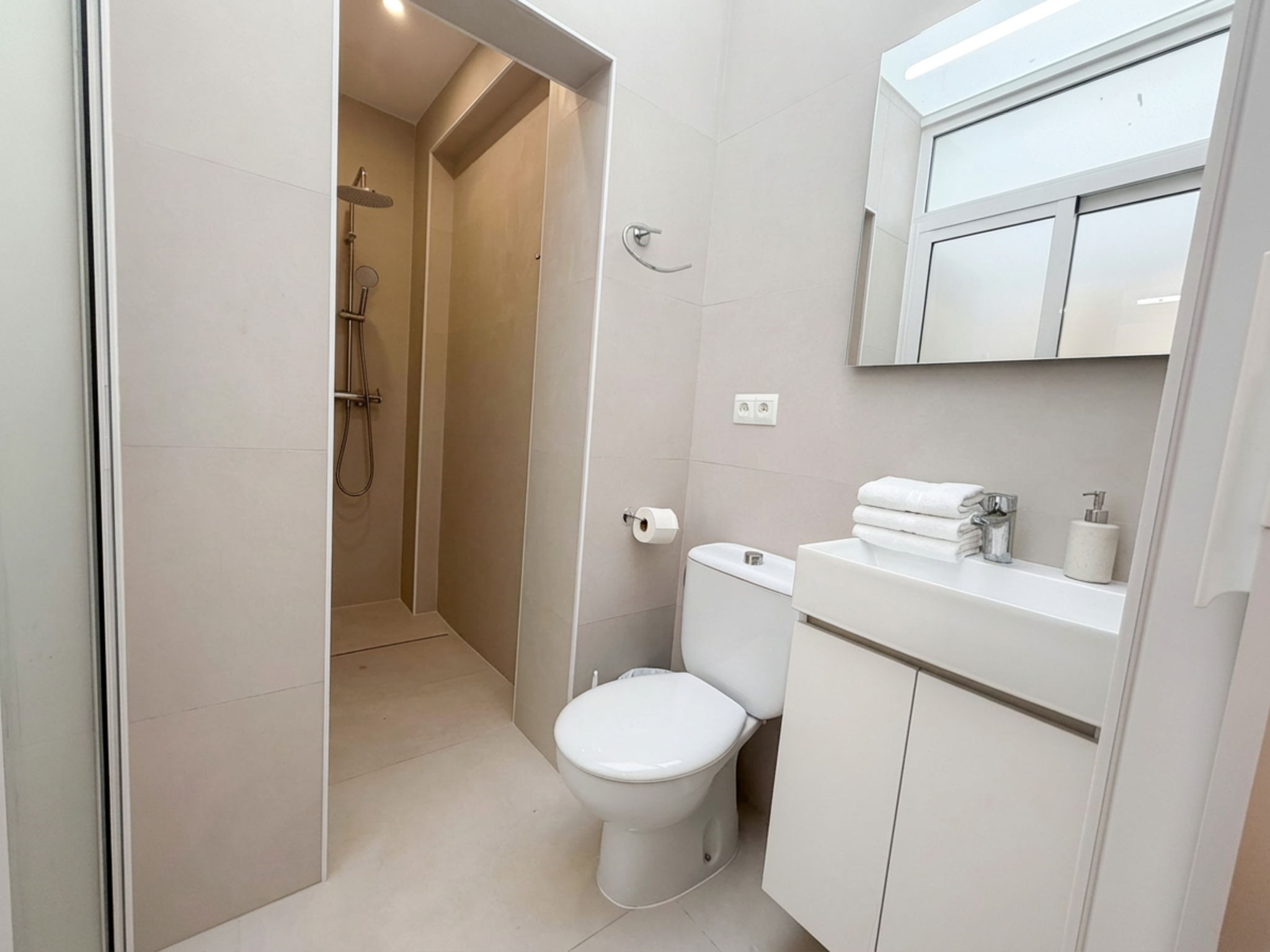 Het huis is verdeeld over drie niveaus om privacy en comfort te garanderen. De begane grond is ontworpen voor functionaliteit: het beschikt over de woon-eetkamer, de keuken met vaatwasser en een slaapkamer met een tweepersoonsbed en badkamer en-suite met douche, wat onafhankelijkheid biedt ten opzichte van de rest van de groep. Op de eerste verdieping bevinden zich nog twee slaapkamers met tweepersoonsbedden, beide met directe toegang tot een privébalkon dat uitkijkt over de levendige Calle Cristo, zodat je de polsslag van het centrum van Nerja kunt ervaren. Een tweede volledige badkamer met douche bedient dit niveau, zodat er 's ochtends geen wachttijden zijn.Privé-dakterras met Middagzon en Volledige Privacy