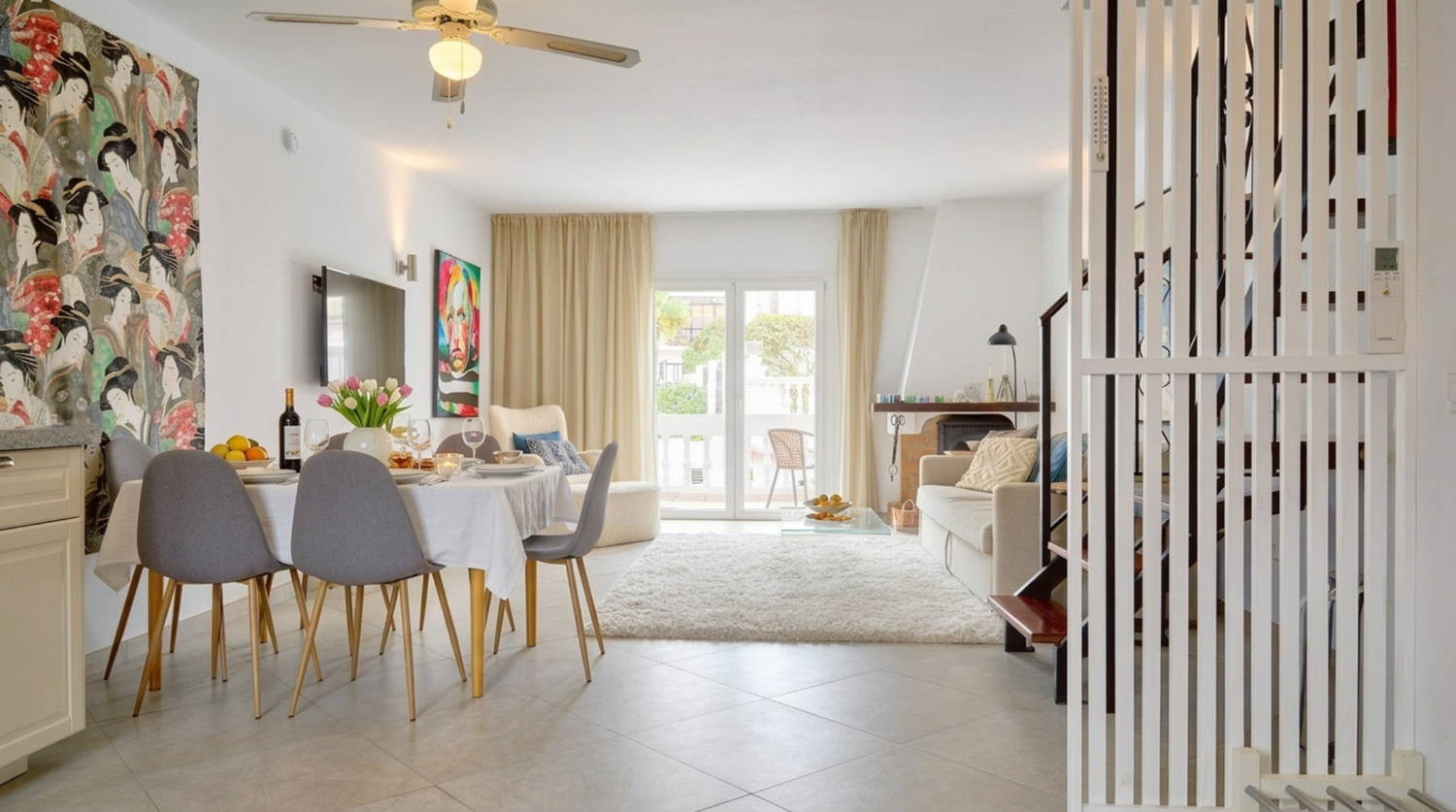 Deze geschakelde woning in de woonwijk La Hacienda is een van de meest complete opties voor een vakantiehuis in Nerja. Vanuit de bevoorrechte positie in de wijk Parador geniet u van uitzicht op de Middellandse Zee en het gemak van een ligging op slechts 350 m van het Burriana-strand. De woning heeft een verzorgde inrichting in Andalusische stijl en biedt rust vlakbij de zee zonder de voorzieningen van het centrum van Nerja op te geven.Indeling en capaciteit voor 6 personen