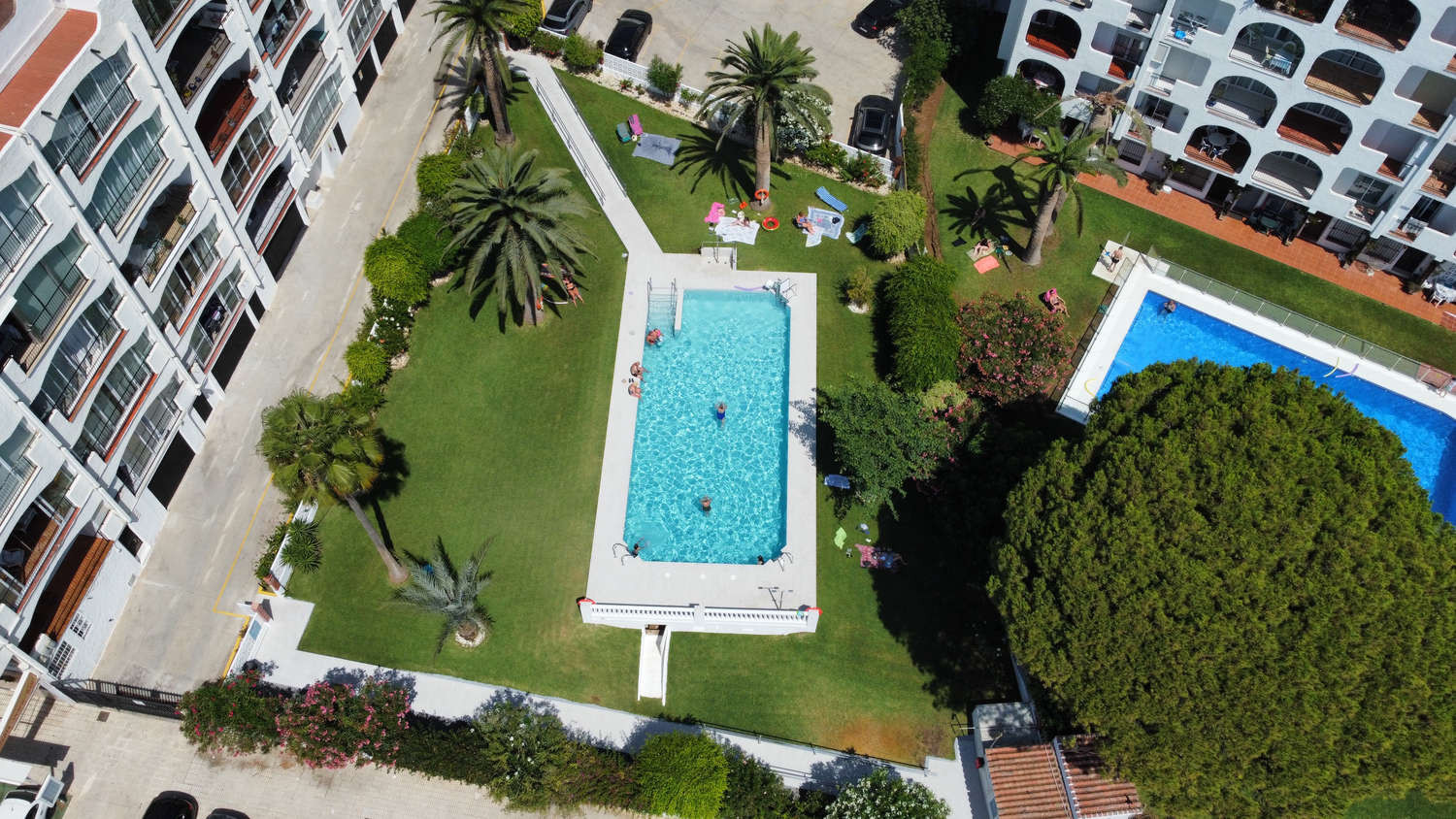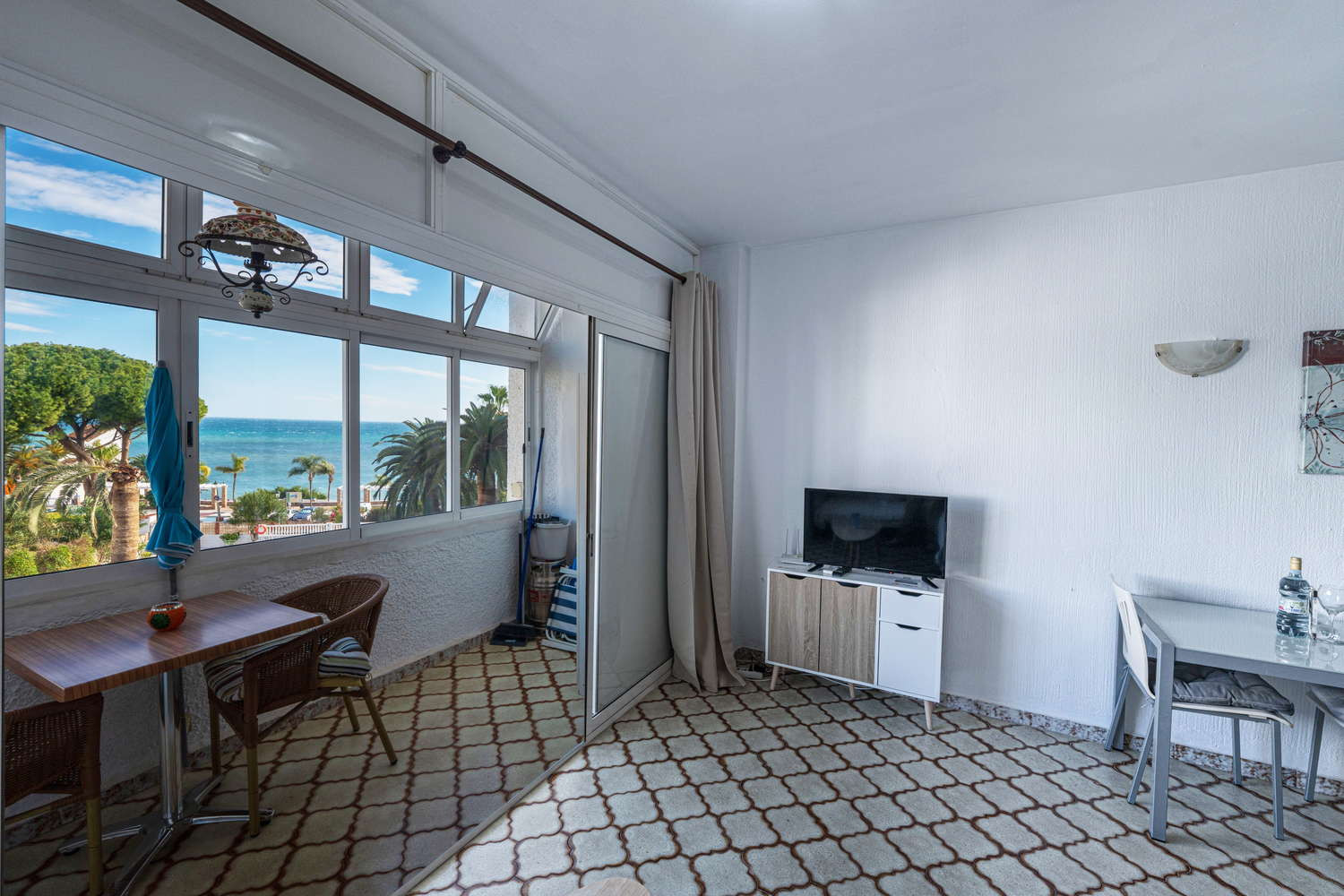 Studio in dit zeer goed gelegen gebouw met een gescheiden slaapruimte, keuken, badkamer en een verglaasd balkon. Satelliet t.v. en WiFi. Zicht over tuin met zwembad en de zee. Privéparkeerplaats bij het gebouw.