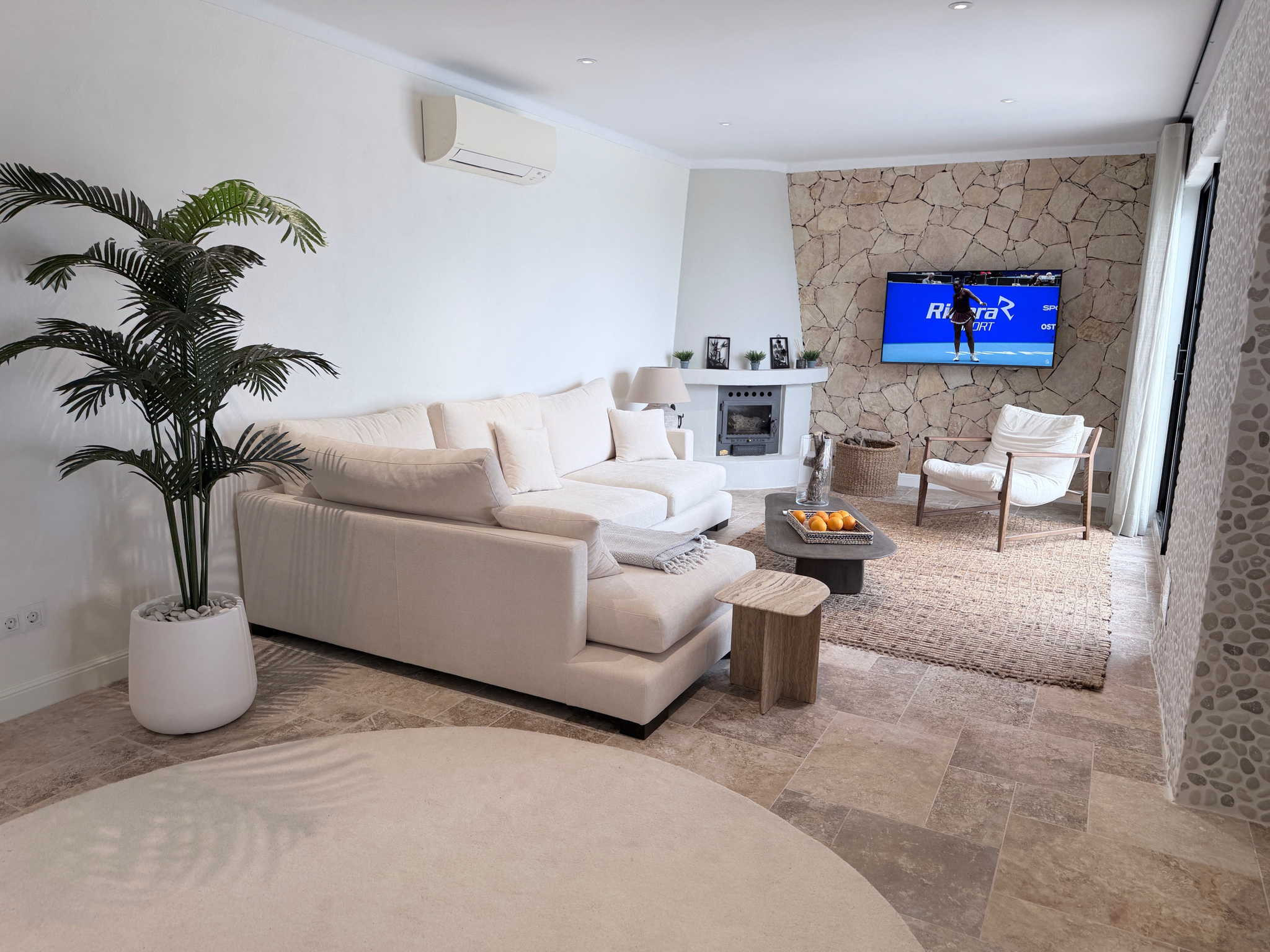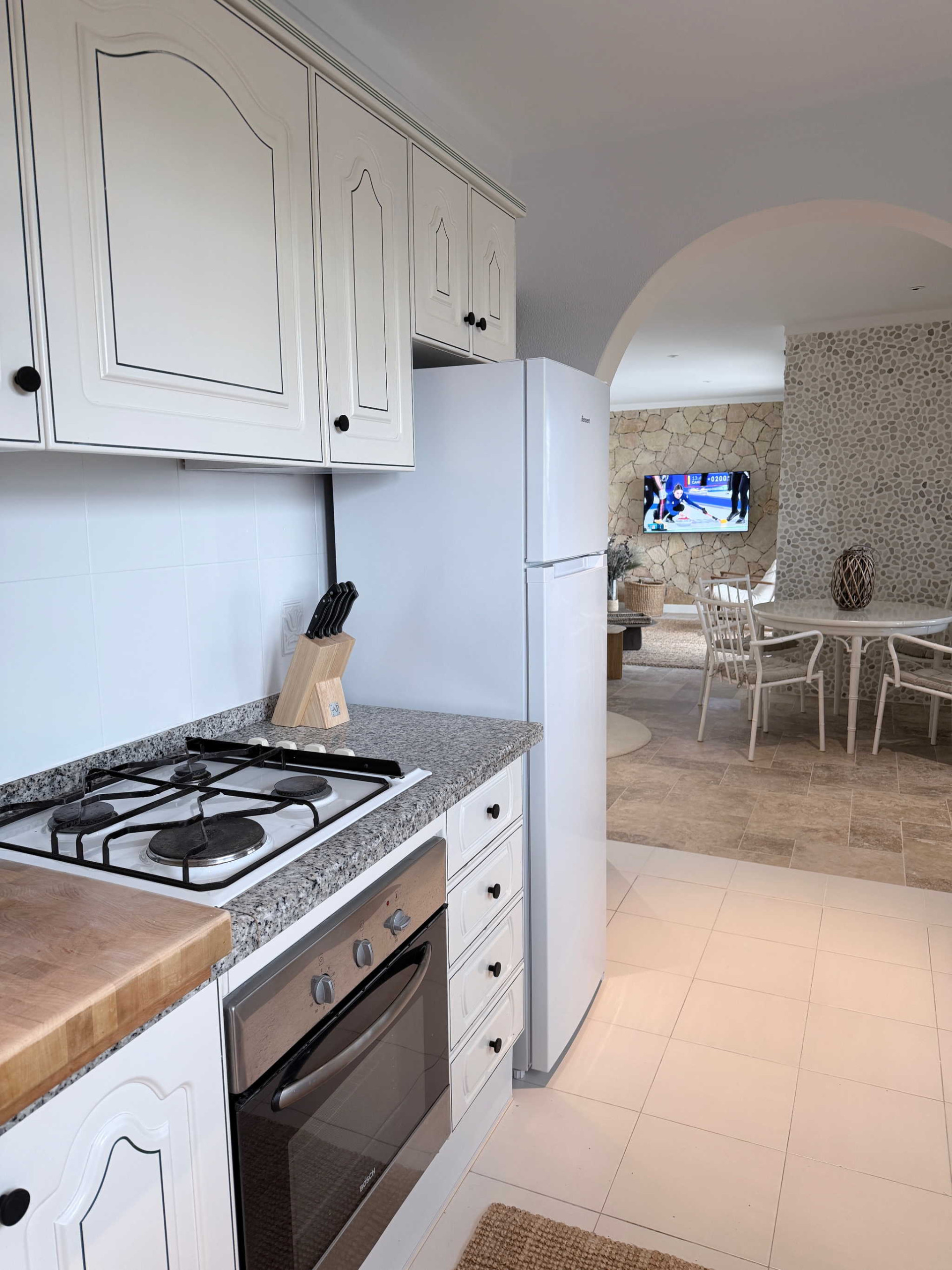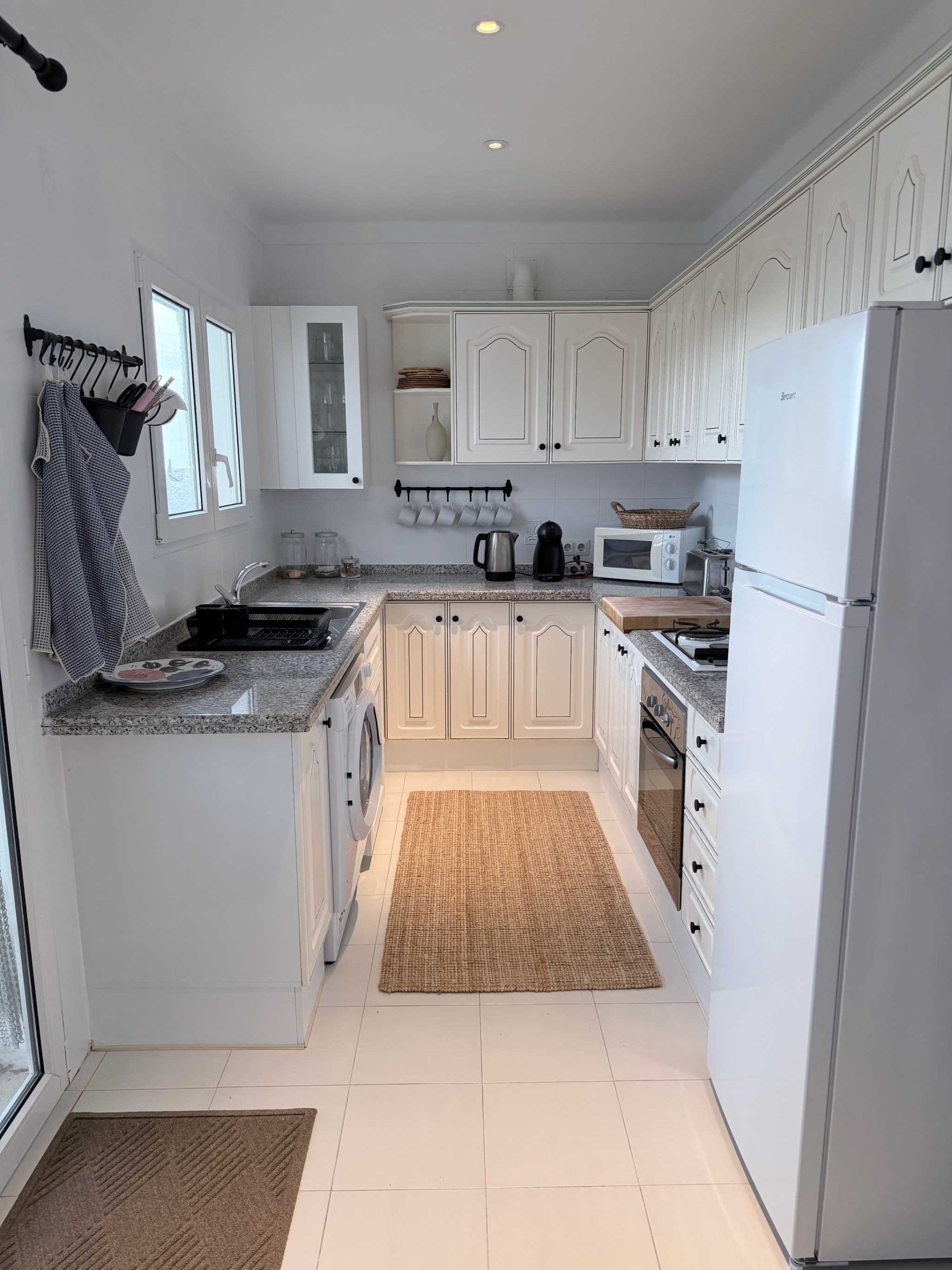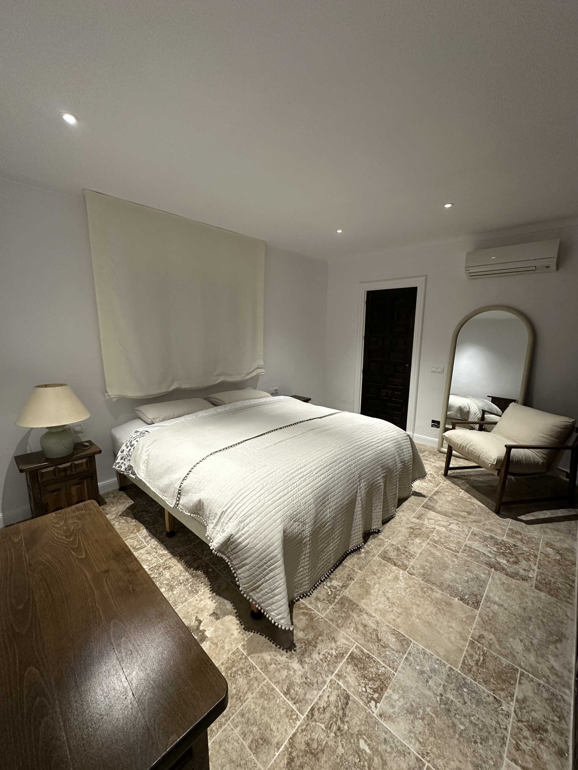 De indeling van het huis is ontworpen voor het comfort van vier personen. Bij binnenkomst is er een praktisch gastentoilet voor de gemeenschappelijke ruimtes. Aan de linkerkant is de eerste slaapkamer, uitgerust met een tweepersoonsbed van goede kwaliteit en een privé en-suite badkamer. De woonkamer, ingericht in een eigentijdse en gezellige stijl, sluit aan op een volledig uitgeruste semi-open keuken. Aan de andere kant van de kamer heeft de tweede slaapkamer ook een eigen en-suite badkamer en tweepersoonsbed. Deze “dubbele suite” configuratie zorgt ervoor dat elk stel of gast zijn eigen privéruimte heeft zonder een badkamer te delen.