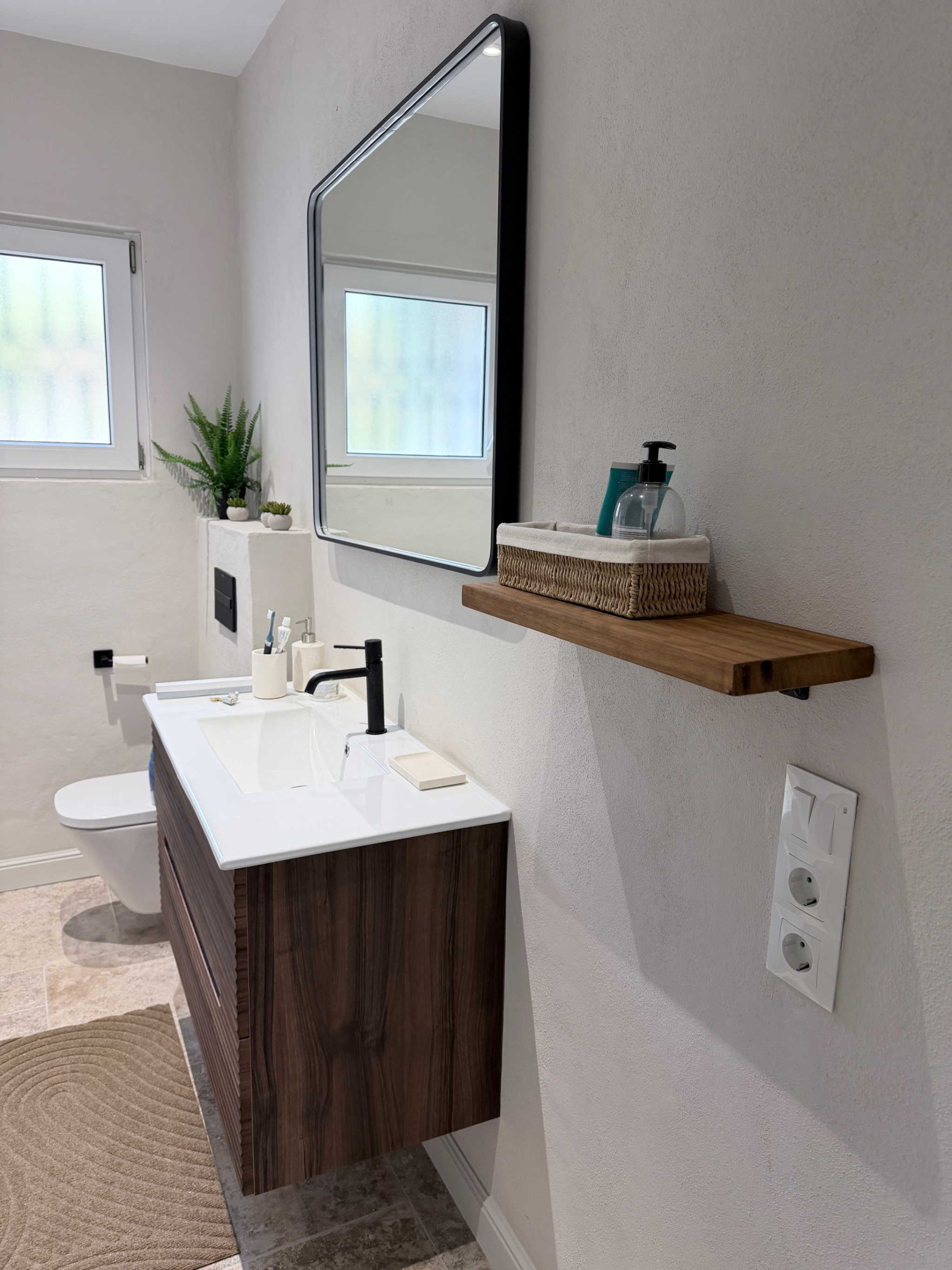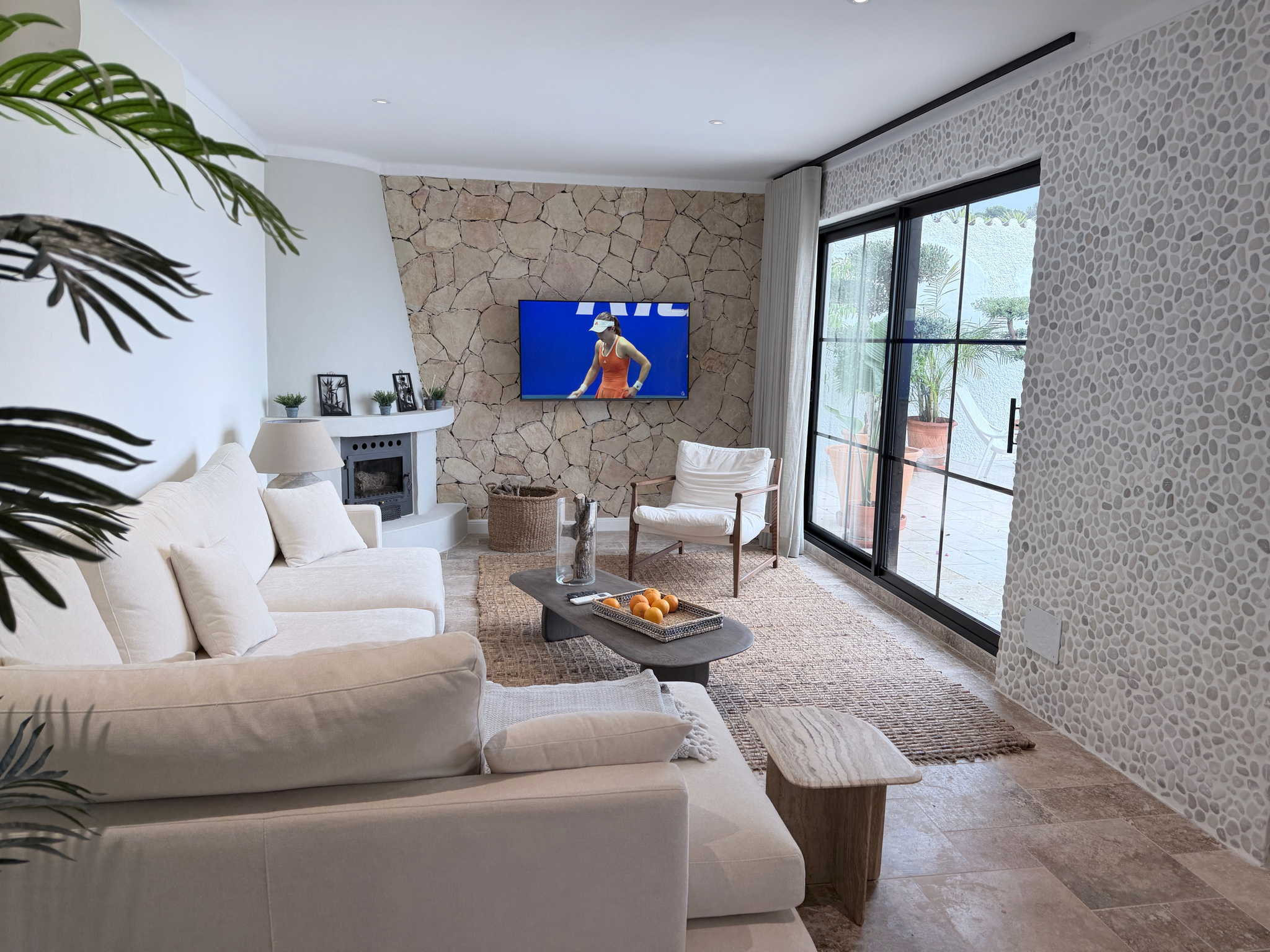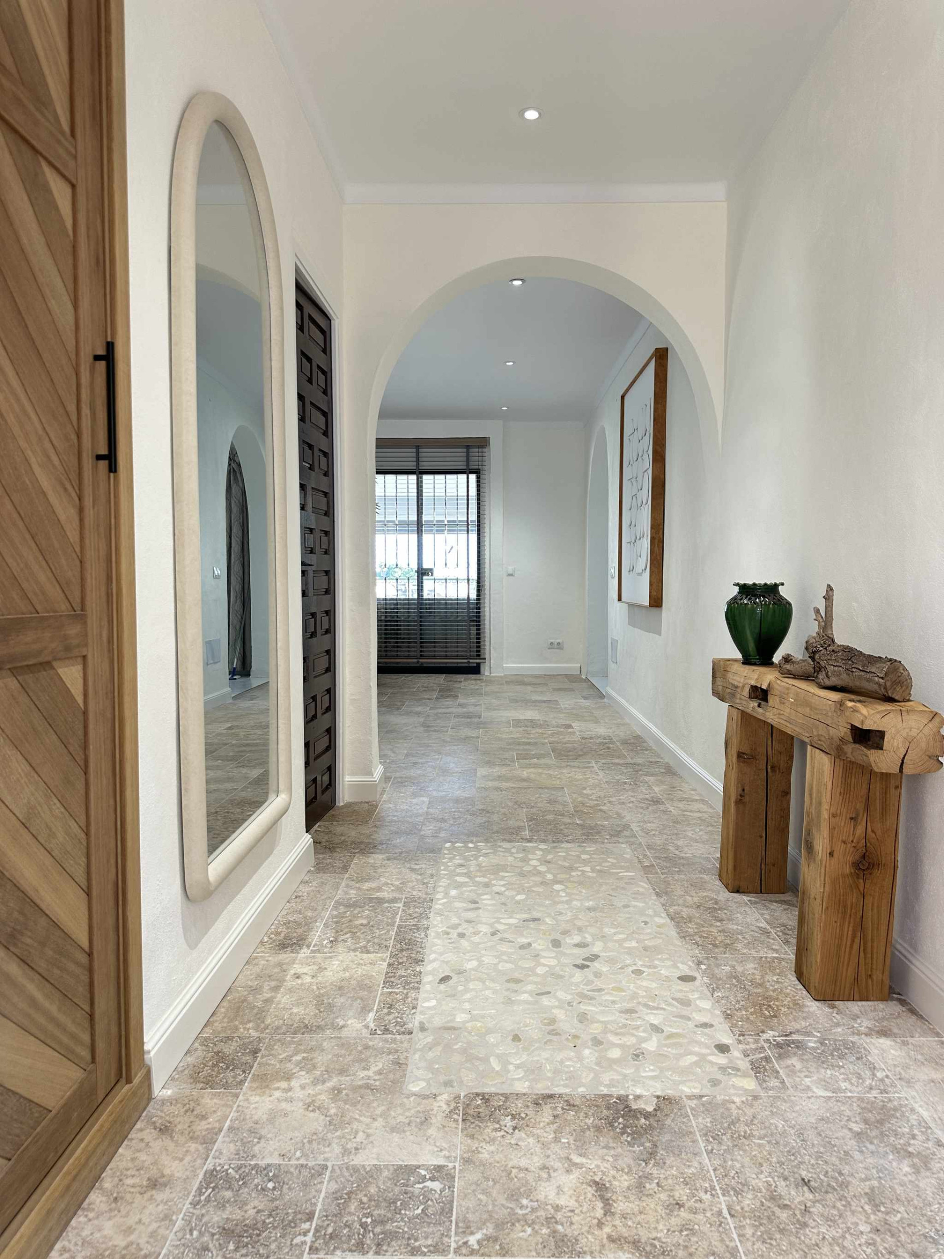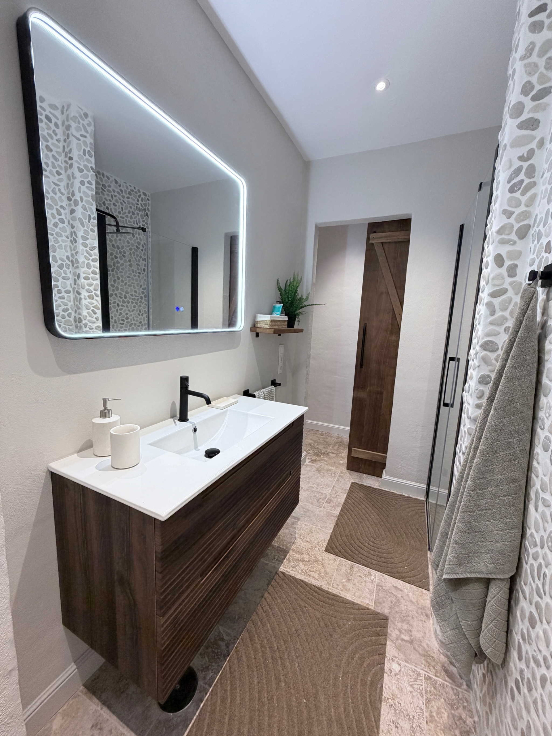 De indeling van het huis is ontworpen voor het comfort van vier personen. Bij binnenkomst is er een praktisch gastentoilet voor de gemeenschappelijke ruimtes. Aan de linkerkant is de eerste slaapkamer, uitgerust met een tweepersoonsbed van goede kwaliteit en een privé en-suite badkamer. De woonkamer, ingericht in een eigentijdse en gezellige stijl, sluit aan op een volledig uitgeruste semi-open keuken. Aan de andere kant van de kamer heeft de tweede slaapkamer ook een eigen en-suite badkamer en tweepersoonsbed. Deze “dubbele suite” configuratie zorgt ervoor dat elk stel of gast zijn eigen privéruimte heeft zonder een badkamer te delen.