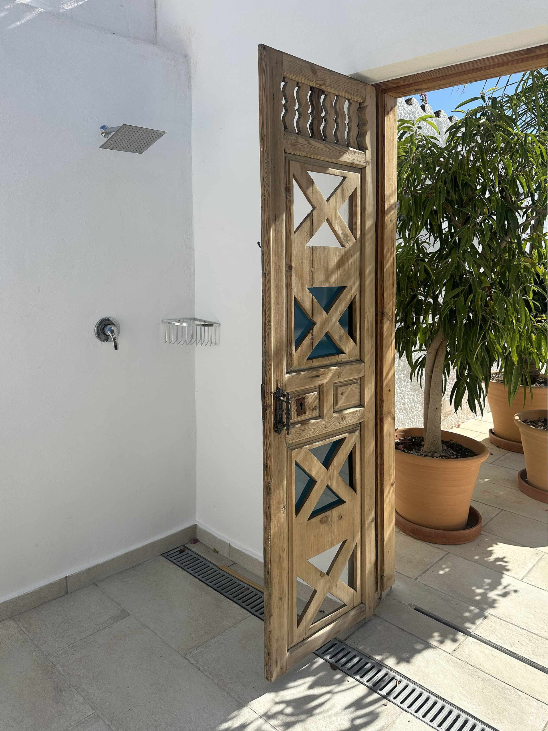 Het exterieur is het hoogtepunt van de villa en is zo georganiseerd dat elke vierkante meter optimaal wordt benut. Zodra je buiten in de zon stapt, vind je het privézwembad met vrij uitzicht en een liggedeelte. Aan de linkerkant is een comfortabele buitendouche en droogruimte, terwijl aan de rechterkant een buitentafel staat om buiten te eten. Via een paar treden naar beneden kom je in een apart tuingedeelte met een eigen ingebouwde barbecue, de perfecte plek om onafhankelijk van het zwemgedeelte te koken op de barbecue.
